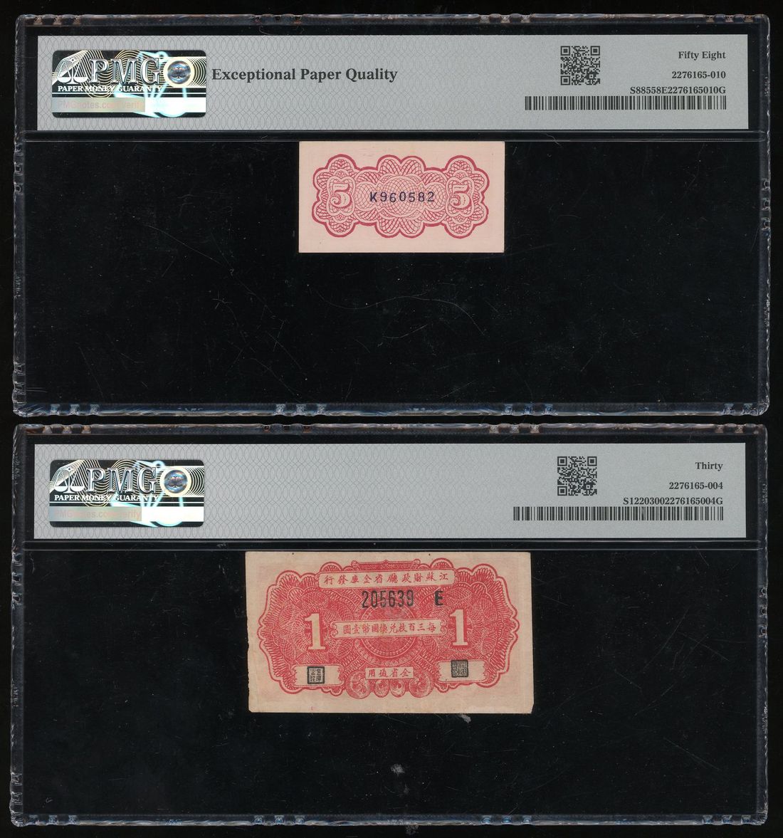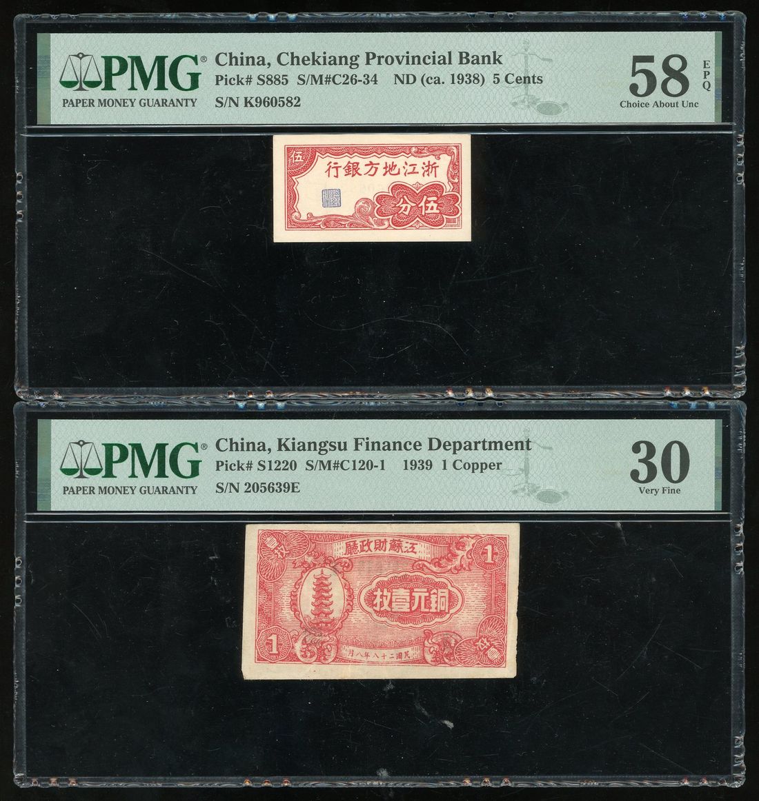 China, a pair, including, -Chekiang Provincial Bank, 5 cents, ND (1938), serial number K960582, PMG 58EPQ,