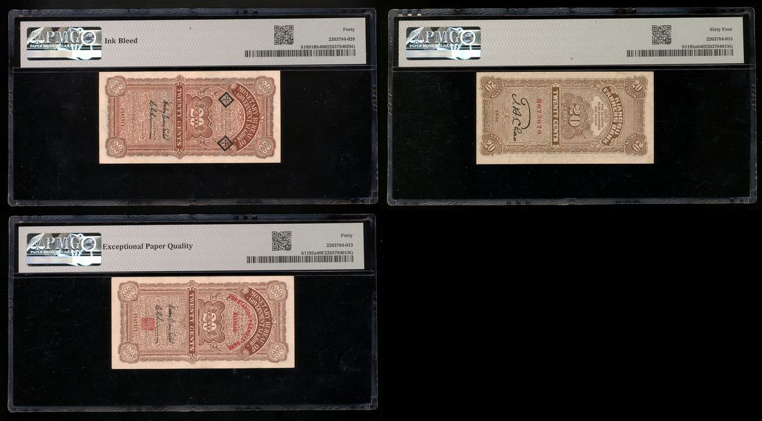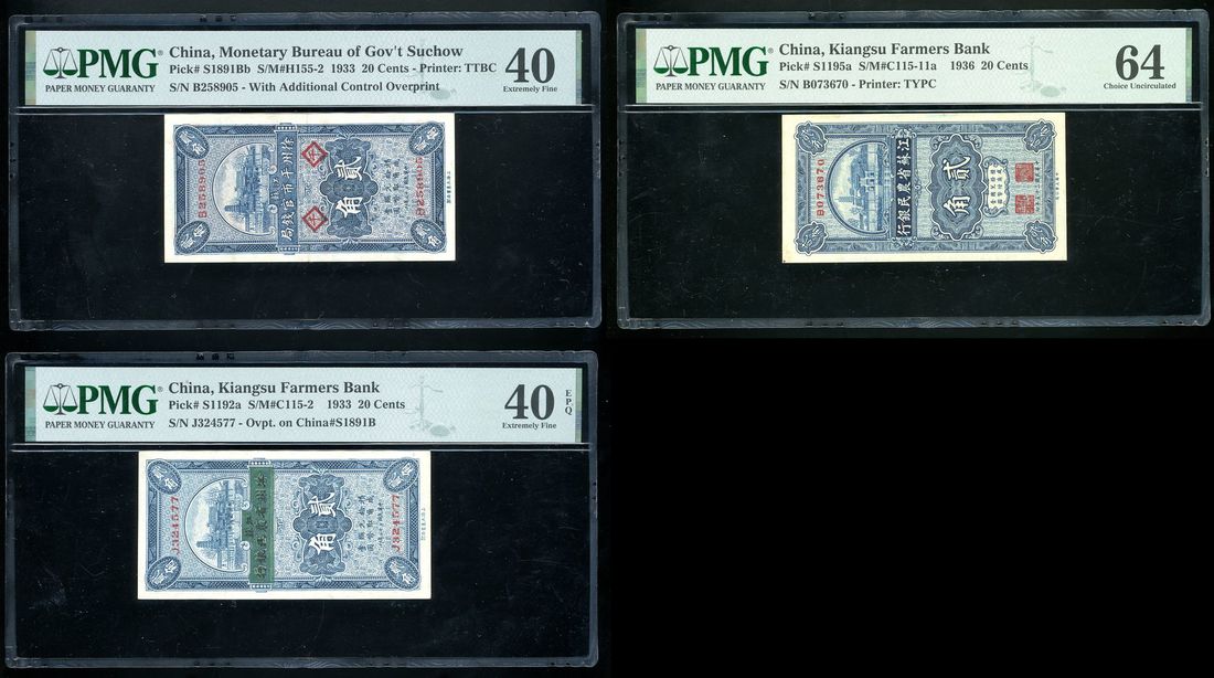 Monetary Bureau of Government Suchow/Kiangsu Farmers Bank, China, a group of 3x 20 cents, 1933(2) and 1936, serial numbers B258905 (with additional control overprint), J324577 (overprint on #S1891B), B073670, (Pick S1891Bb, S1192a, S1195a), PMG 40, ink bleed, 40EPQ and 64, respectively (3)