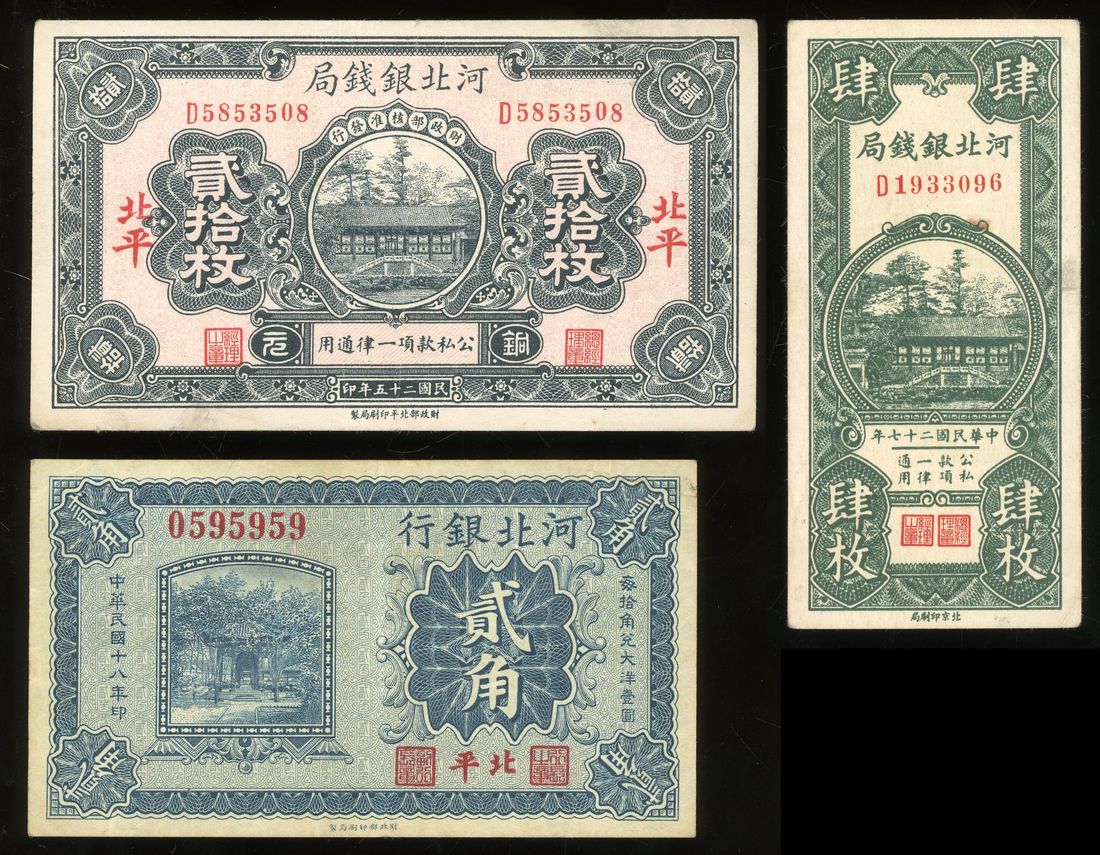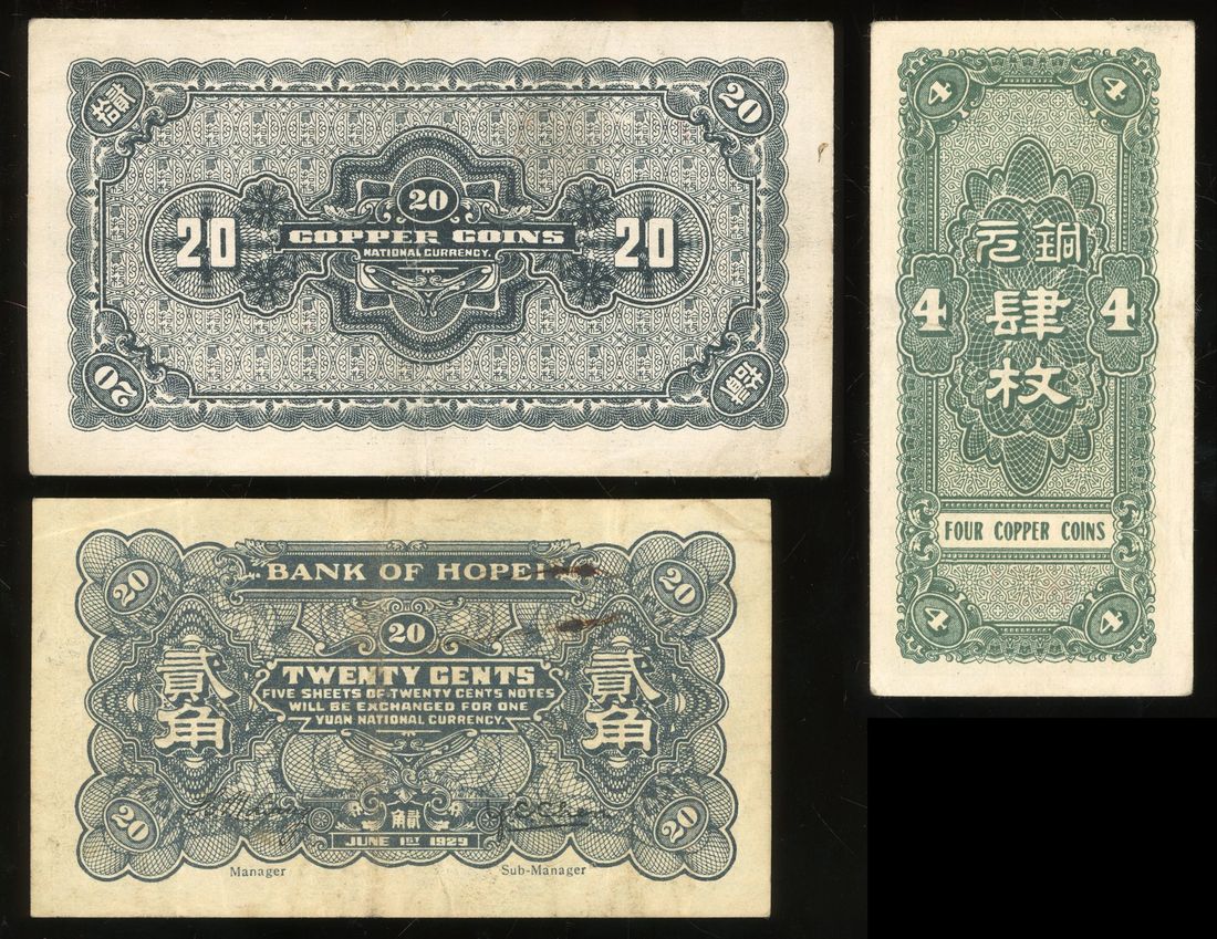 Hupeh, China, a group of 3x banknotes, including, -Ho Pei Metropolitan Bank, 20 coppers Year 18 (1929) and 4 coppers Year 27 (1938),
