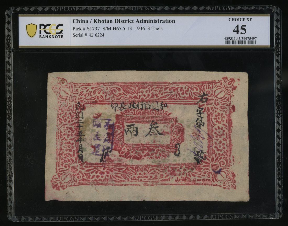 Sinkiang Province, 3 taels, 1936, Khotan District Administration, serial number 6224, (Pick S1737), PCGS Banknote 45
