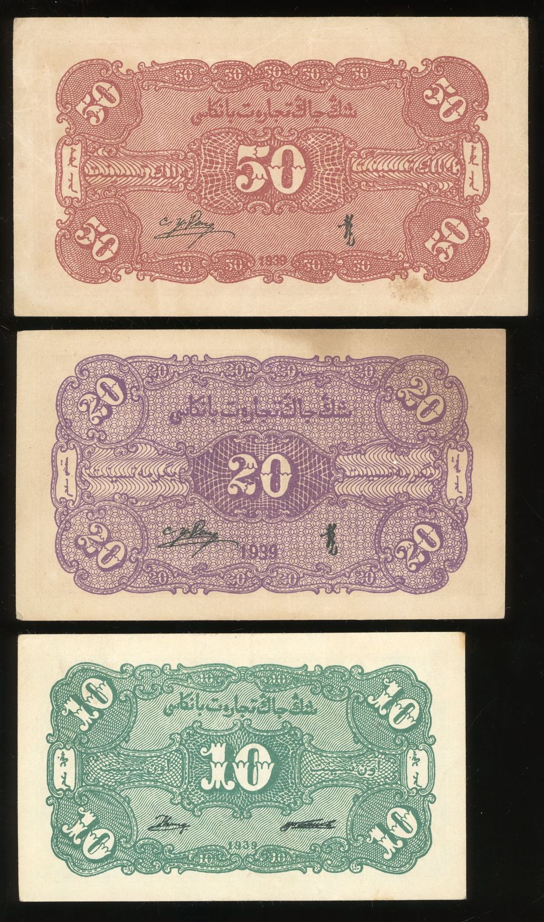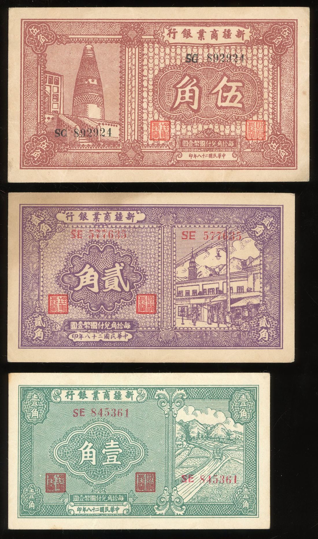 Xinjiang Commercial and Industrial Bank, China, a group of 3x, including 1, 2 and 5 jiao, Year 28 (1939), (Pick S1746, S1747, S1748), good extremely fine (3)