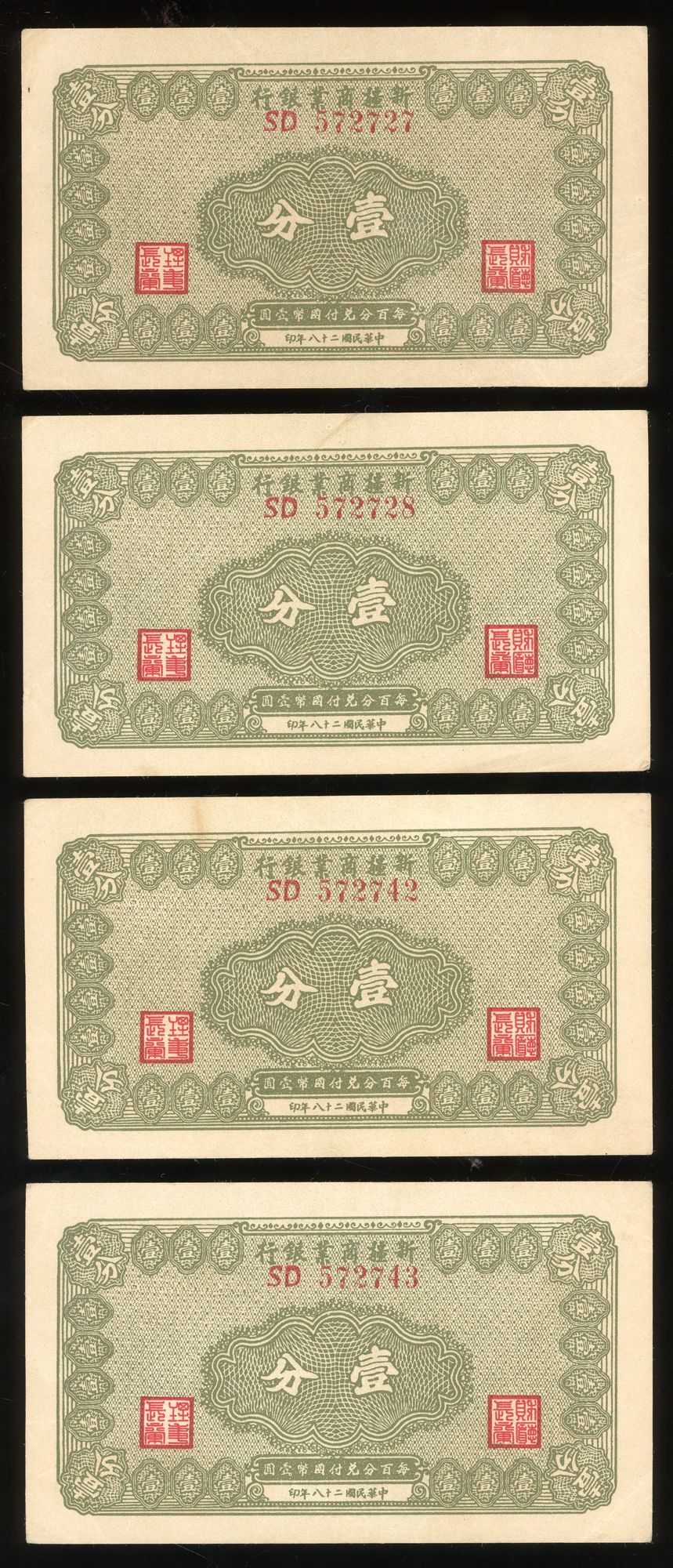 Xinjiang Commercial and Industrial Bank, China, 1 fen (4), Year 28 (1939), (Pick S1743), extremely fine (4)