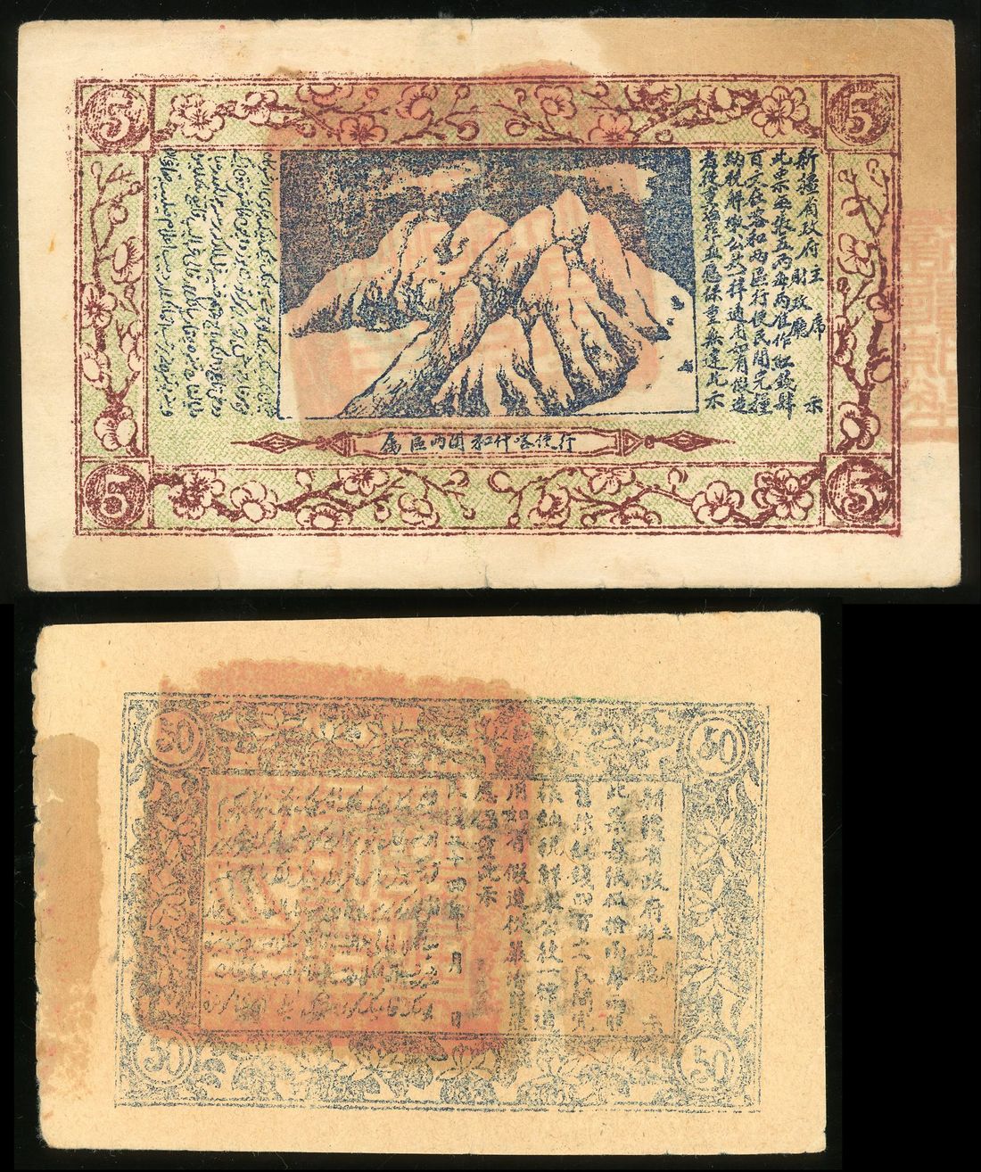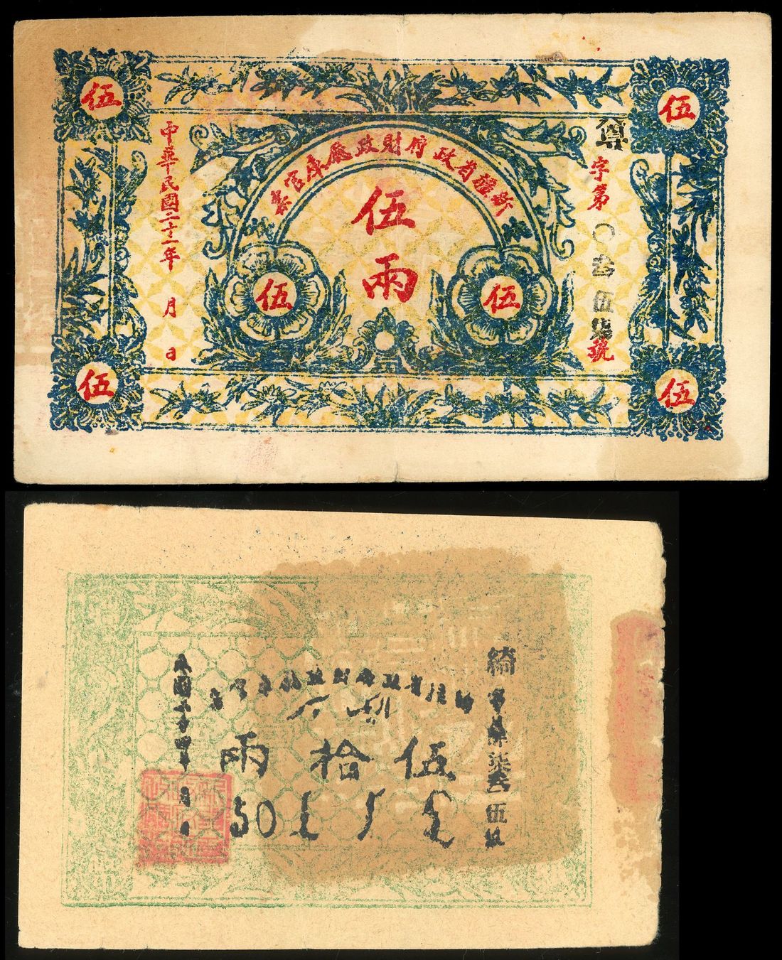 Xinjiang Provincial Government Ministry of Finance Treasury, China, a pair, including 5 taels Year 21 (1932) and 50 taels Year 24( 1935),