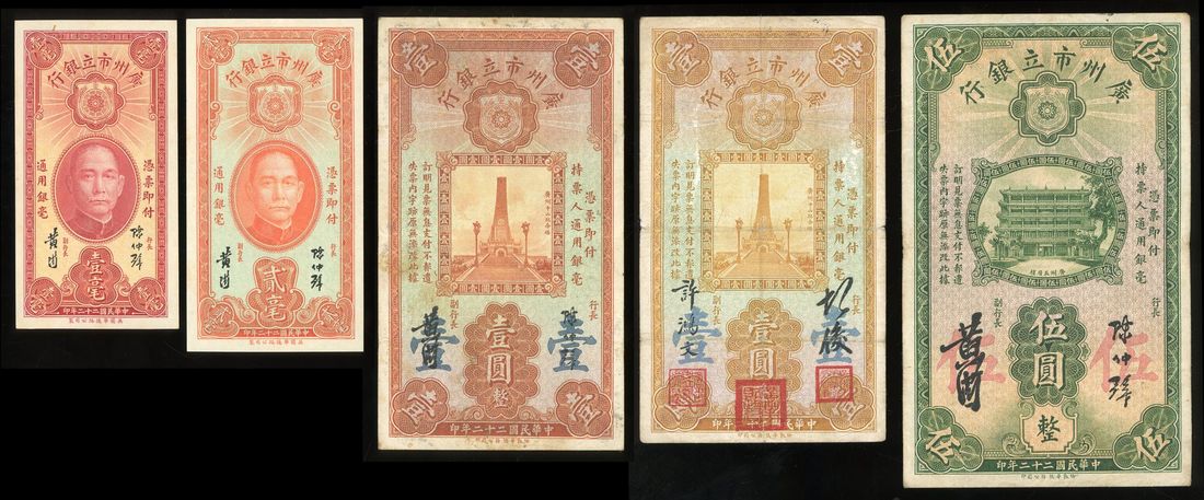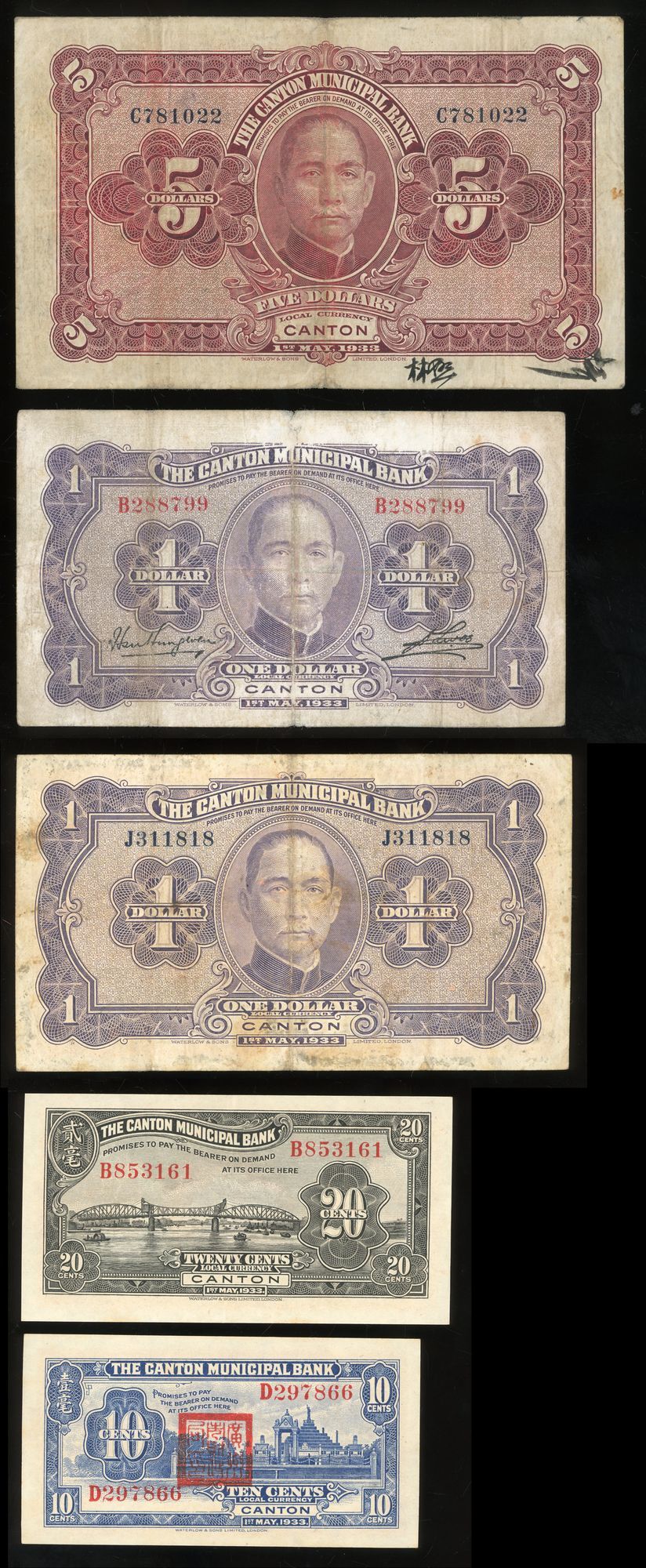 Canton Municipal Bank, China, a group of 5x, 1932-33 issues, including, 10 and 20 cents, 1 (2) and 5 dollars, 1 dollars with different signatures and red chops,