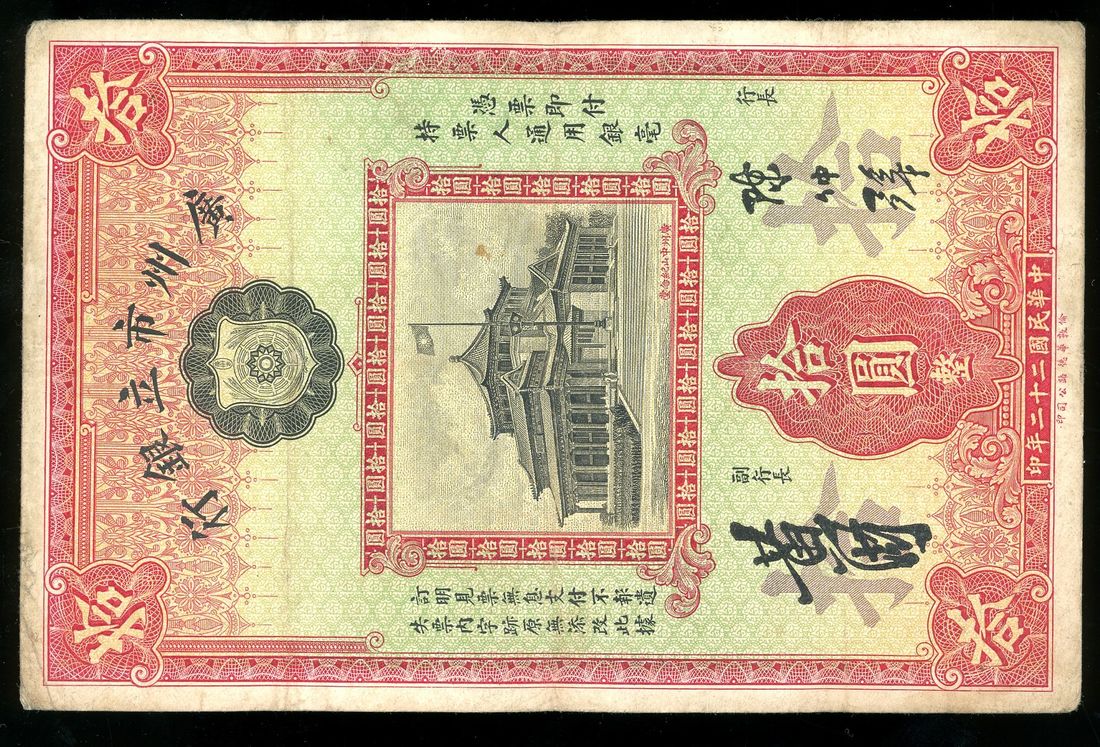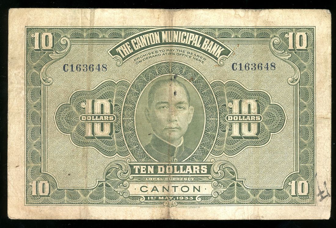 Canton Municipal Bank, China, $10, 1933, Canton, dark blue serial number C163648, (Pick S2280c), Very Fine, Stains, Annotation