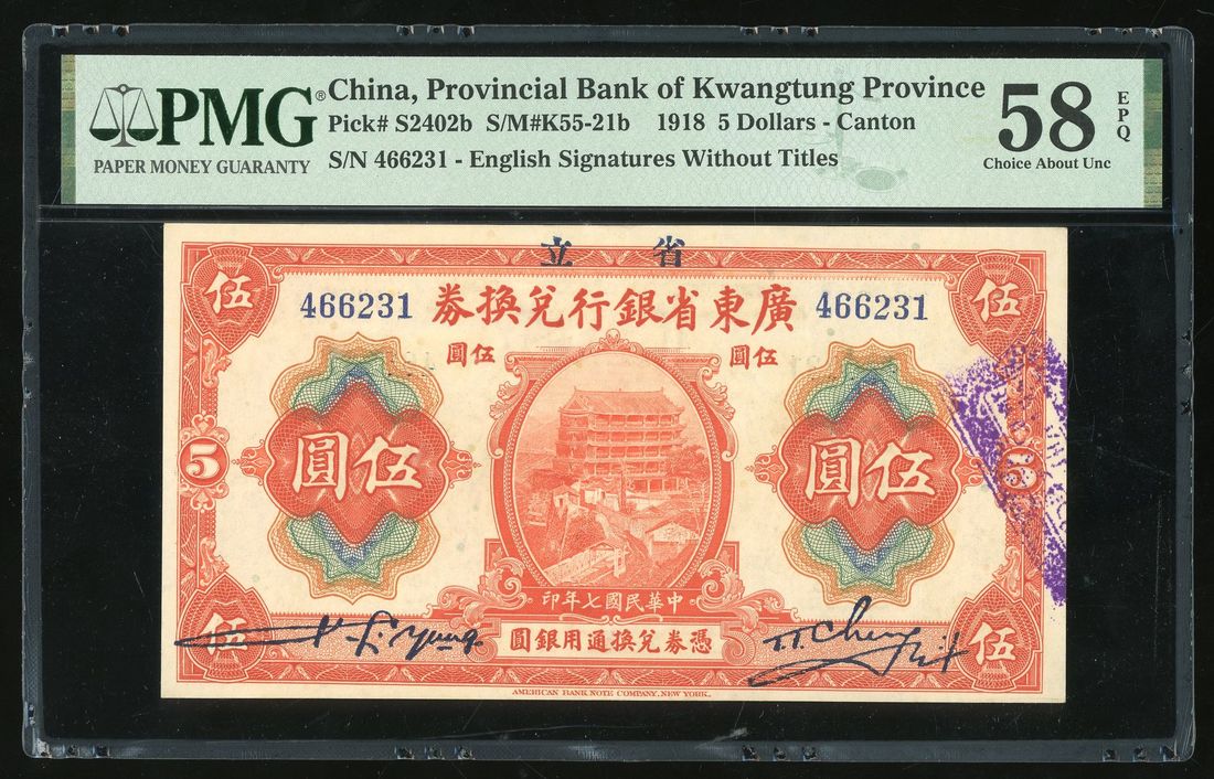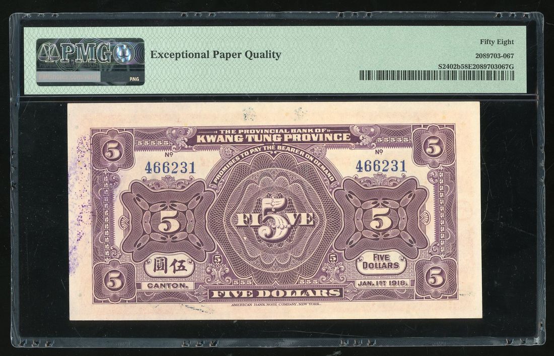 Provincial Bank of Kwangtung Province, China, 5 yuan, 1918, serial number 466231, (Pick 2402b), PMG 58EPQ