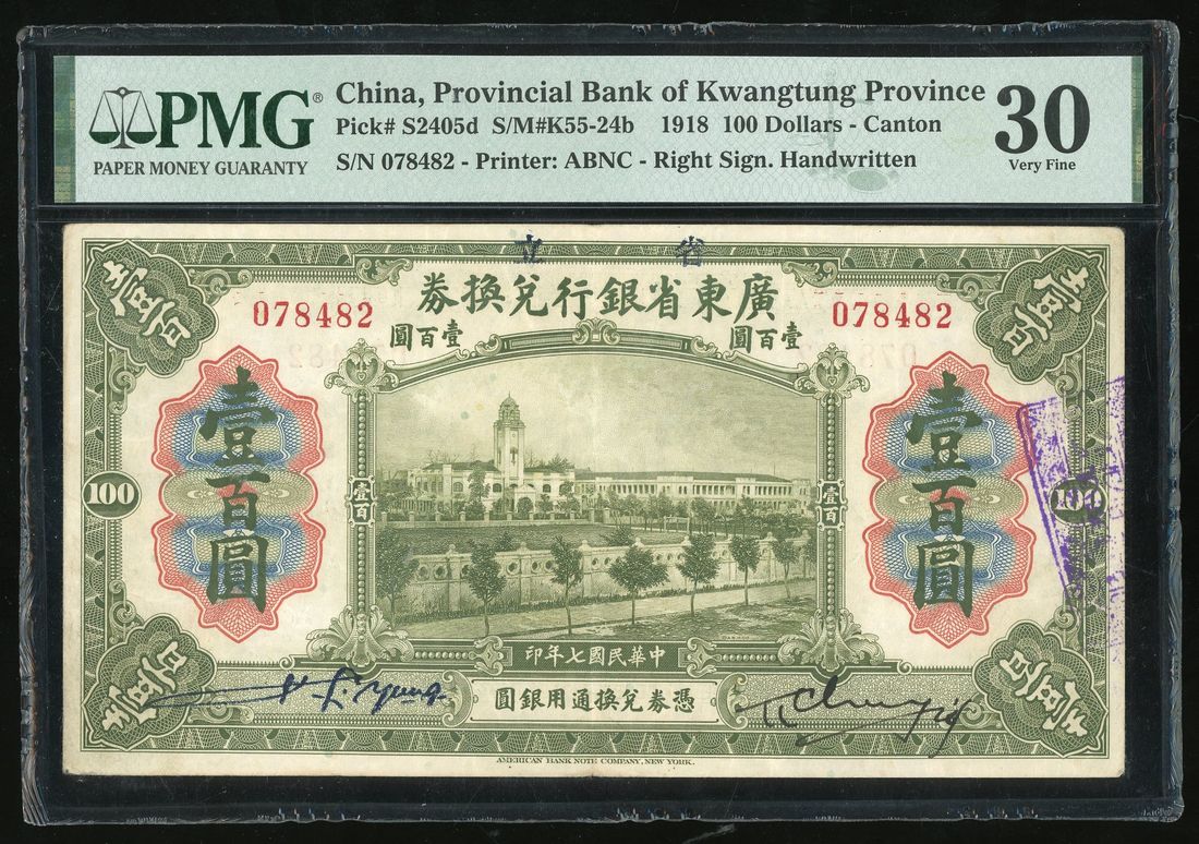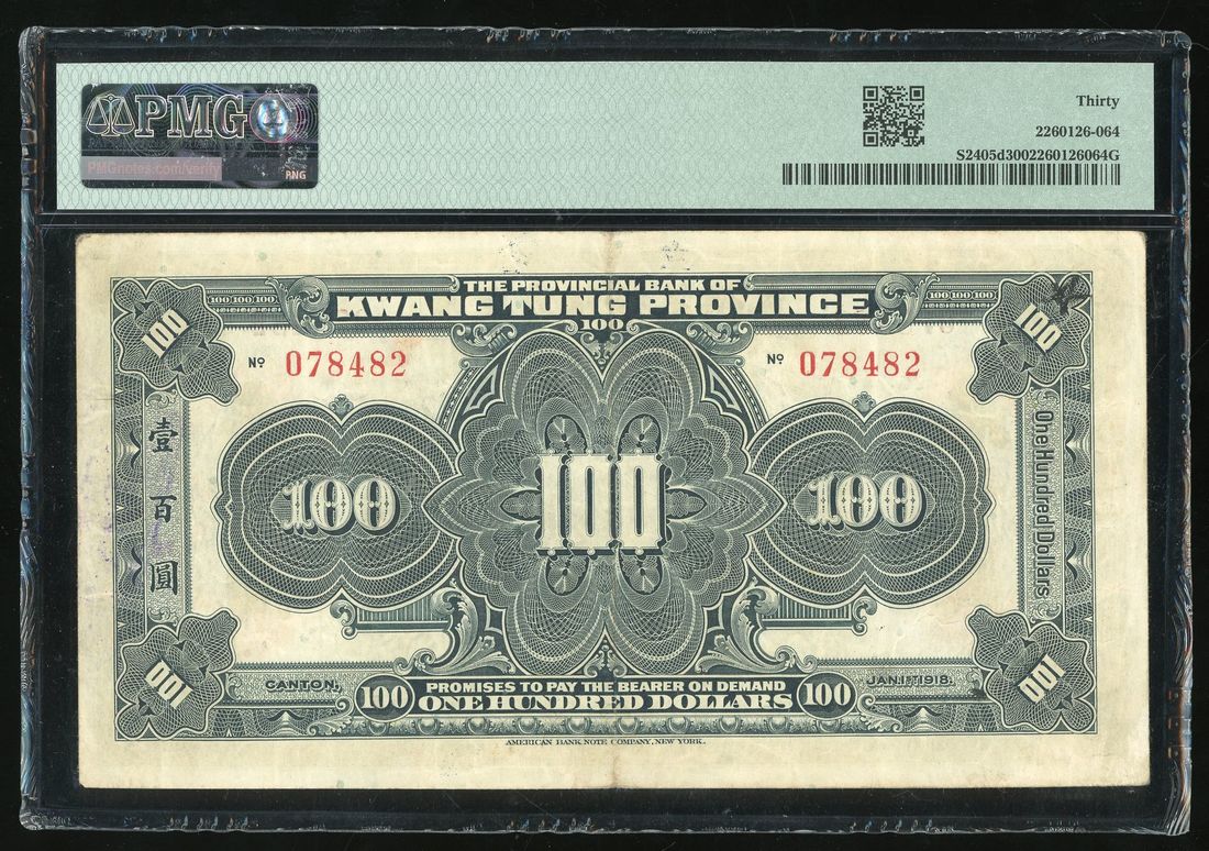 Provincial Bank of Kwangtung Province, China, $100, Year 7 (1918), Canton, serial number 078482, signature at right handsigned,