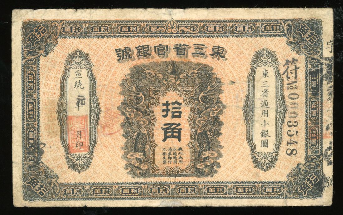 Toong San Sang Government Bank, China, 10 cent pieces, 1st Year of Xuantong (1909), serial number fu 0003548, (Pick S2858), with annotations and stamps, repaired, fine. A scarce early issue