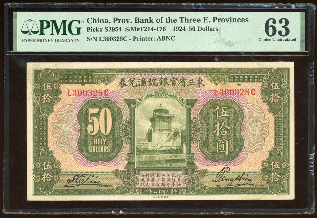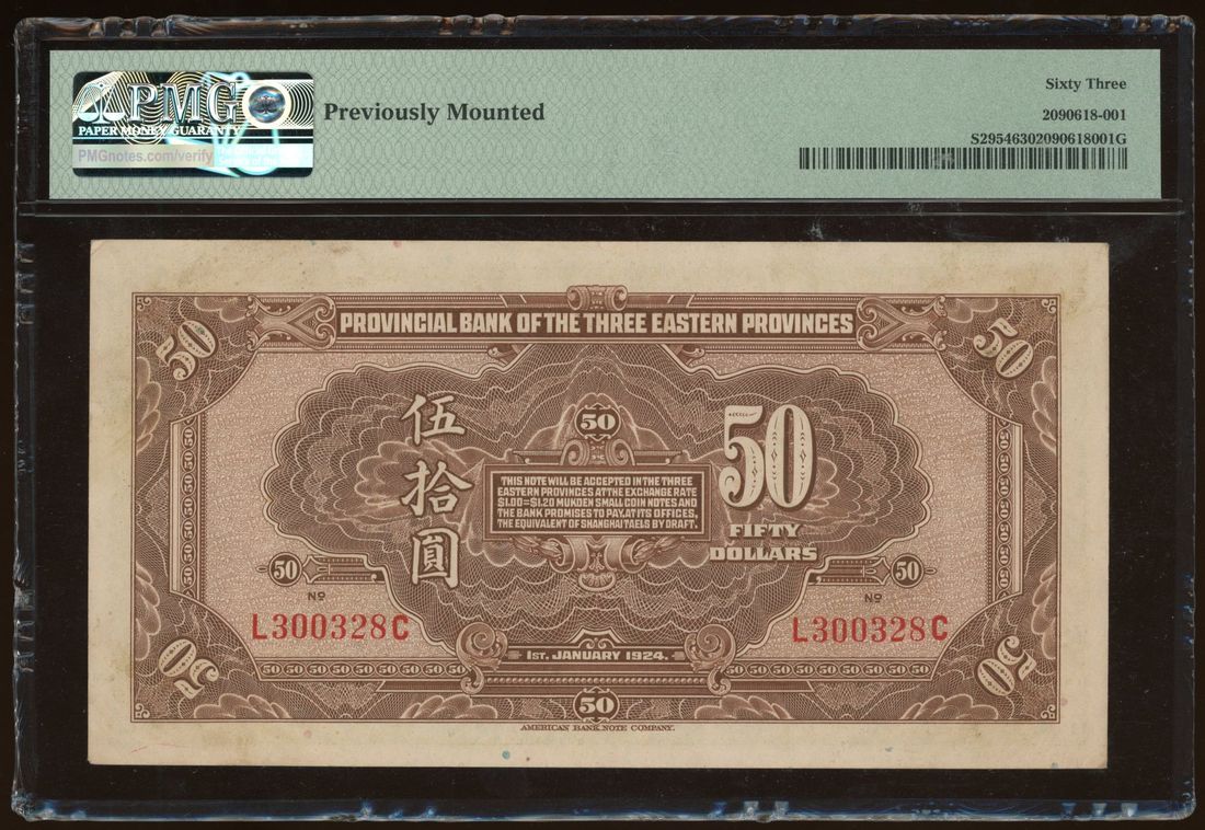 Bank of the Three Eastern Provinces, China, $50, 1924, serial number L 300328 C, (Pick S2954), PMG 63 Choice Uncirculated, the second highest grade in PMG population report
