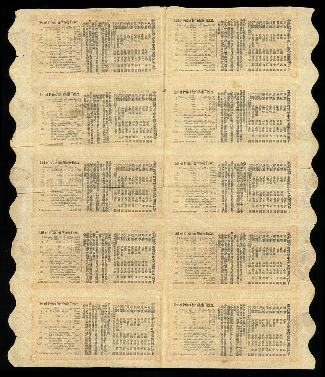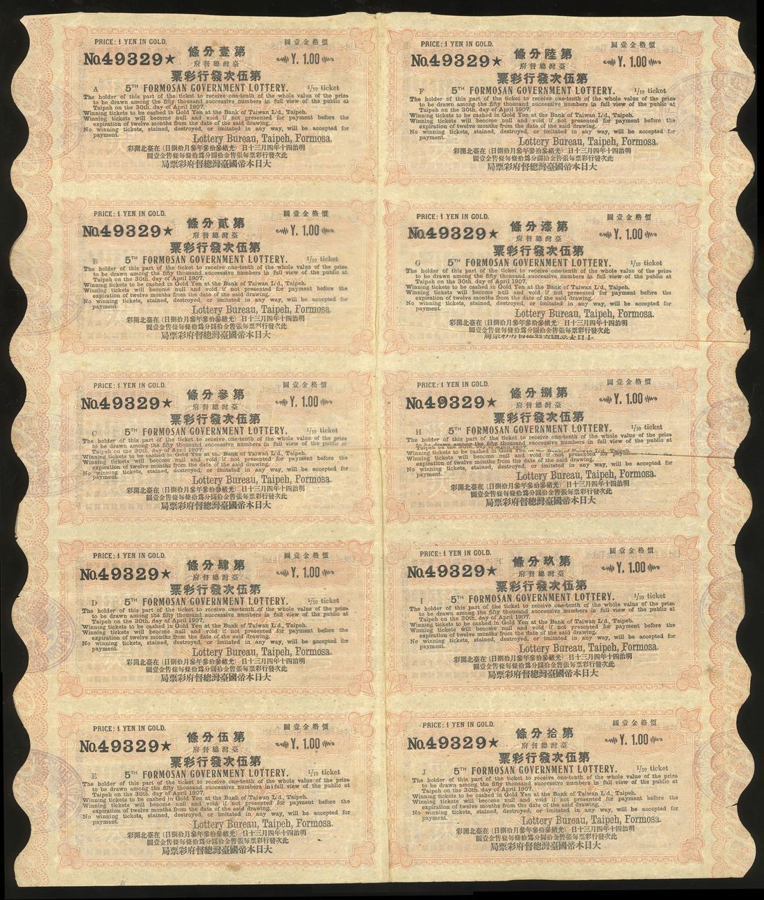 Taiwan/Japanese Occupation, 5th Formosan Government Lottery, block of 10 tickets, 1 yen in gold for each ticket, 1907, number 49329, black on orange, Chinese and English text on obverse, wavy border at left and right, violet seal,