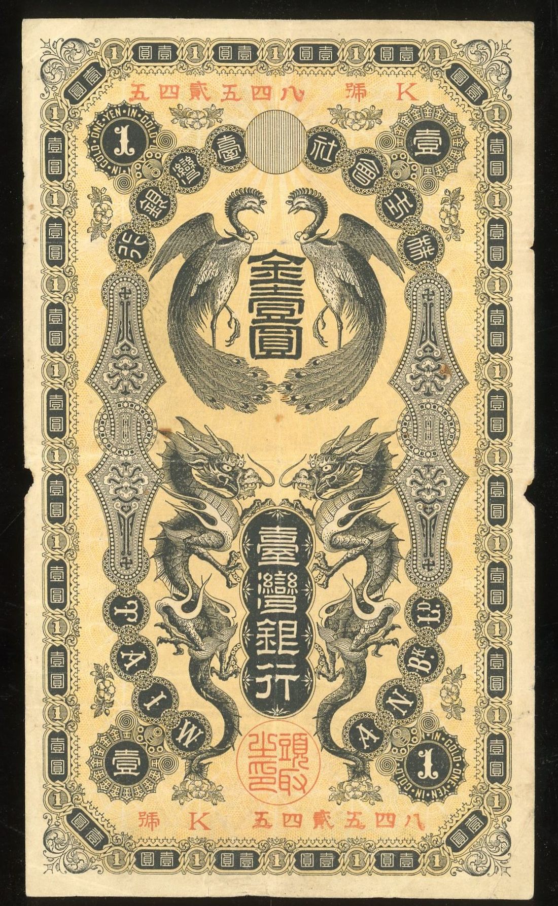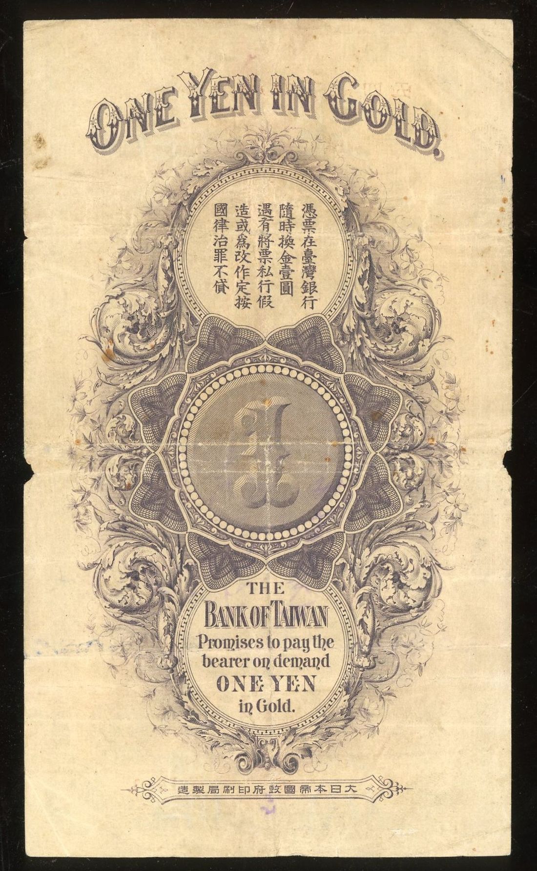 Bank of Taiwan, 1 gold yen, ND (1904), serial number 845245 K, (Pick 1911), F-VF, folds, stains and edges damaged, viewing recommended, sold as is
