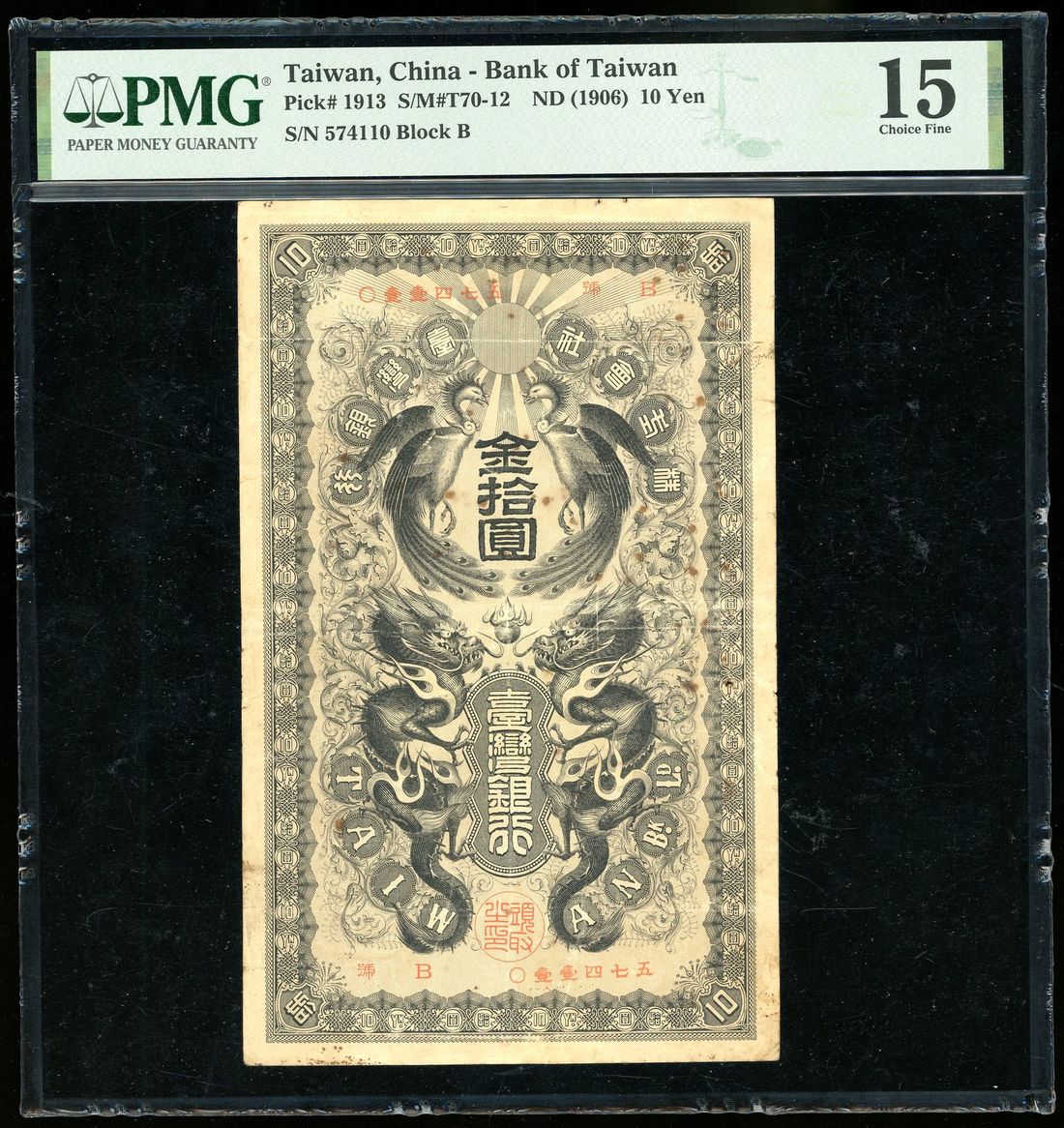 Bank of Taiwan, 10 yen, ND (1906), block B, serial number 574110, black on beige background, Onagadori cockerels at top, dragons at centre, reverse mauve, text and value,