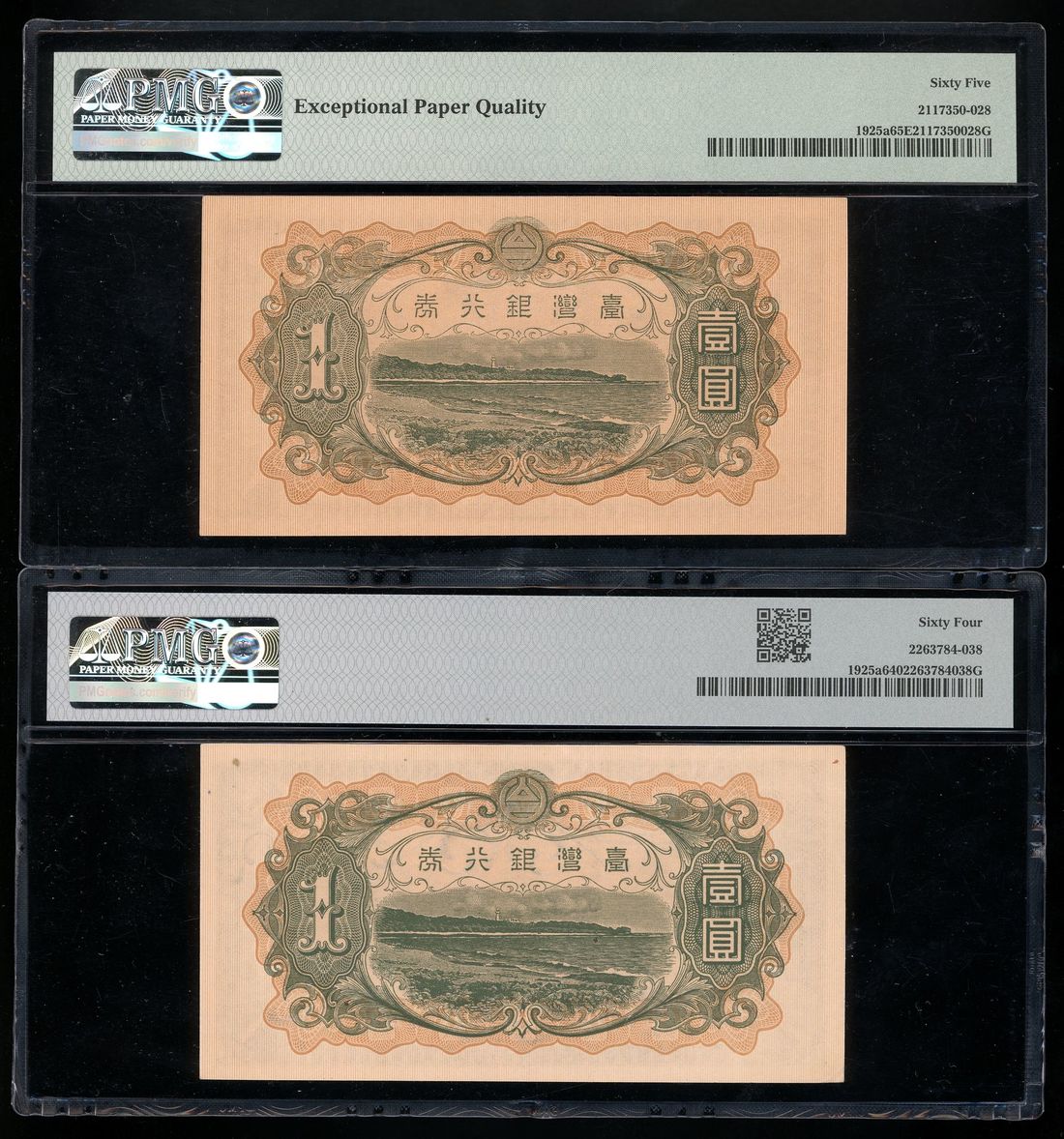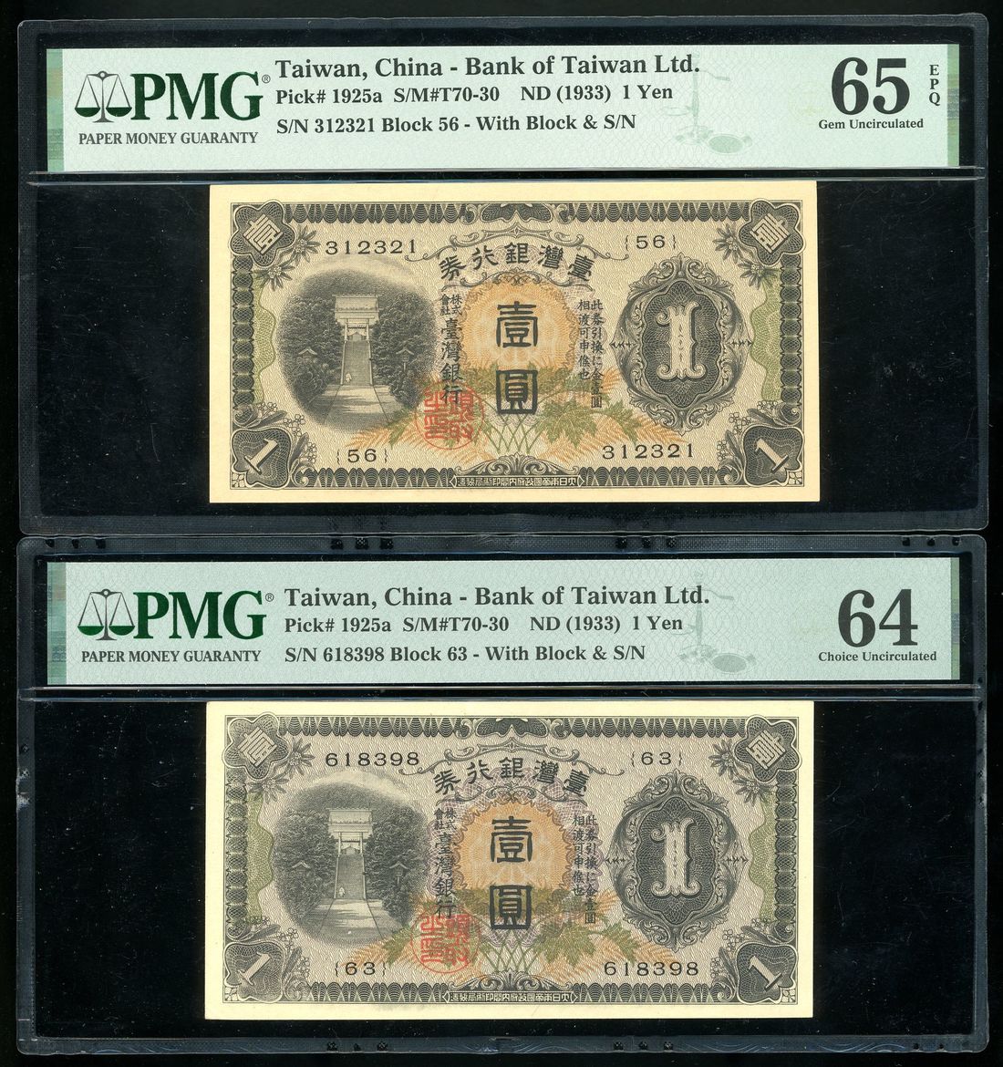Bank of Taiwan, a pair of 1 yen, ND (1933), serial numbers 312321, block 56 and 618398, blcok 63, (Pick 1925a), PMG 65EPQ and 64 respectively (2)