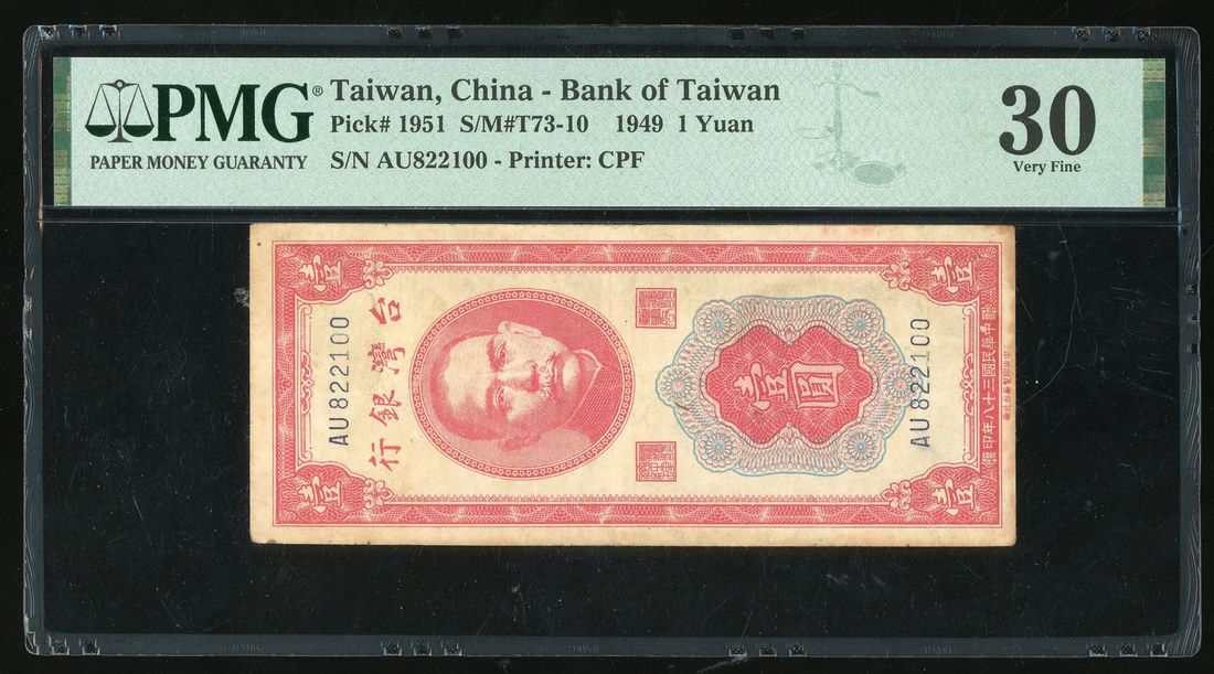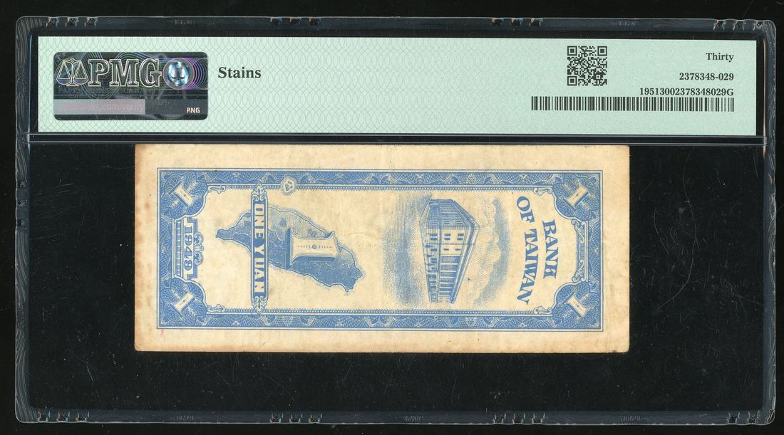 Bank of Taiwan, 1 yuan, Year 38 (1949), serial number AU822100, (Pick 1951), PMG 30, stains.