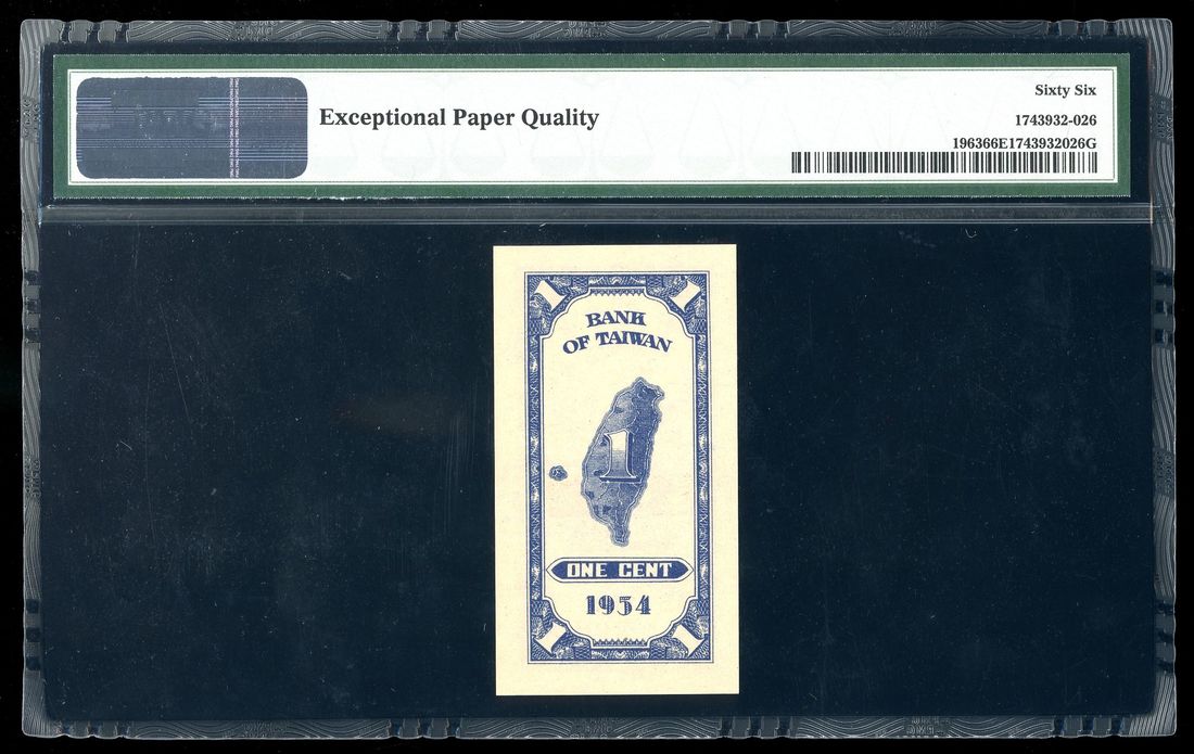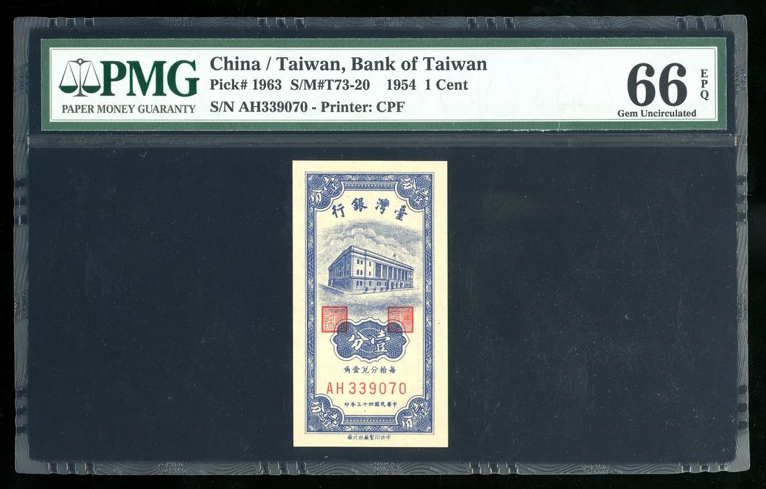 Bank of Taiwan, 1 cent, 1963, serial number AH 339070, (Pick 1963), PMG 66EPQ