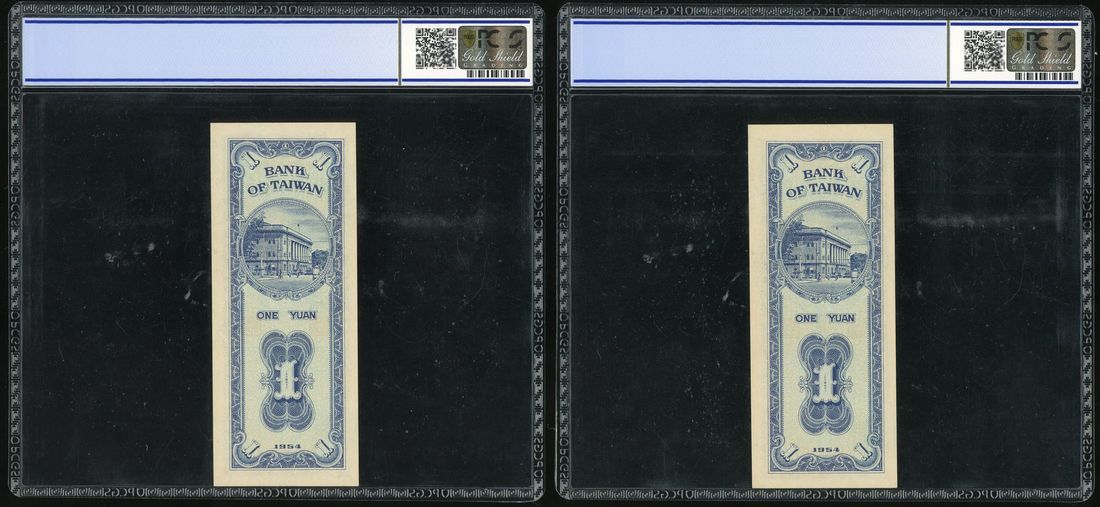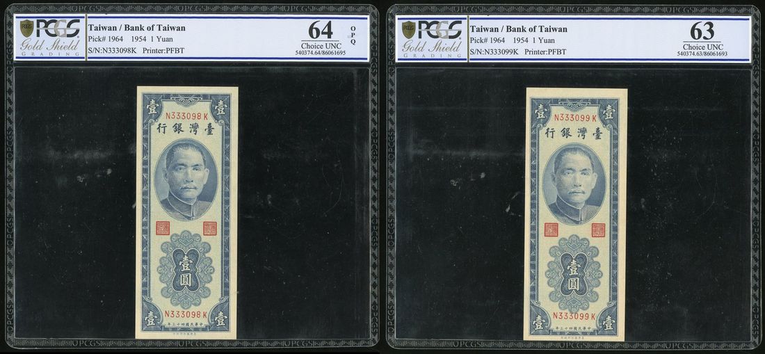 Bank of Taiwan , consecutive pair 1 yuan, Year 43 (1954), serial number N333098/88K, (Pick 1964), PCGS 64OPQ and 63 respectively (2)