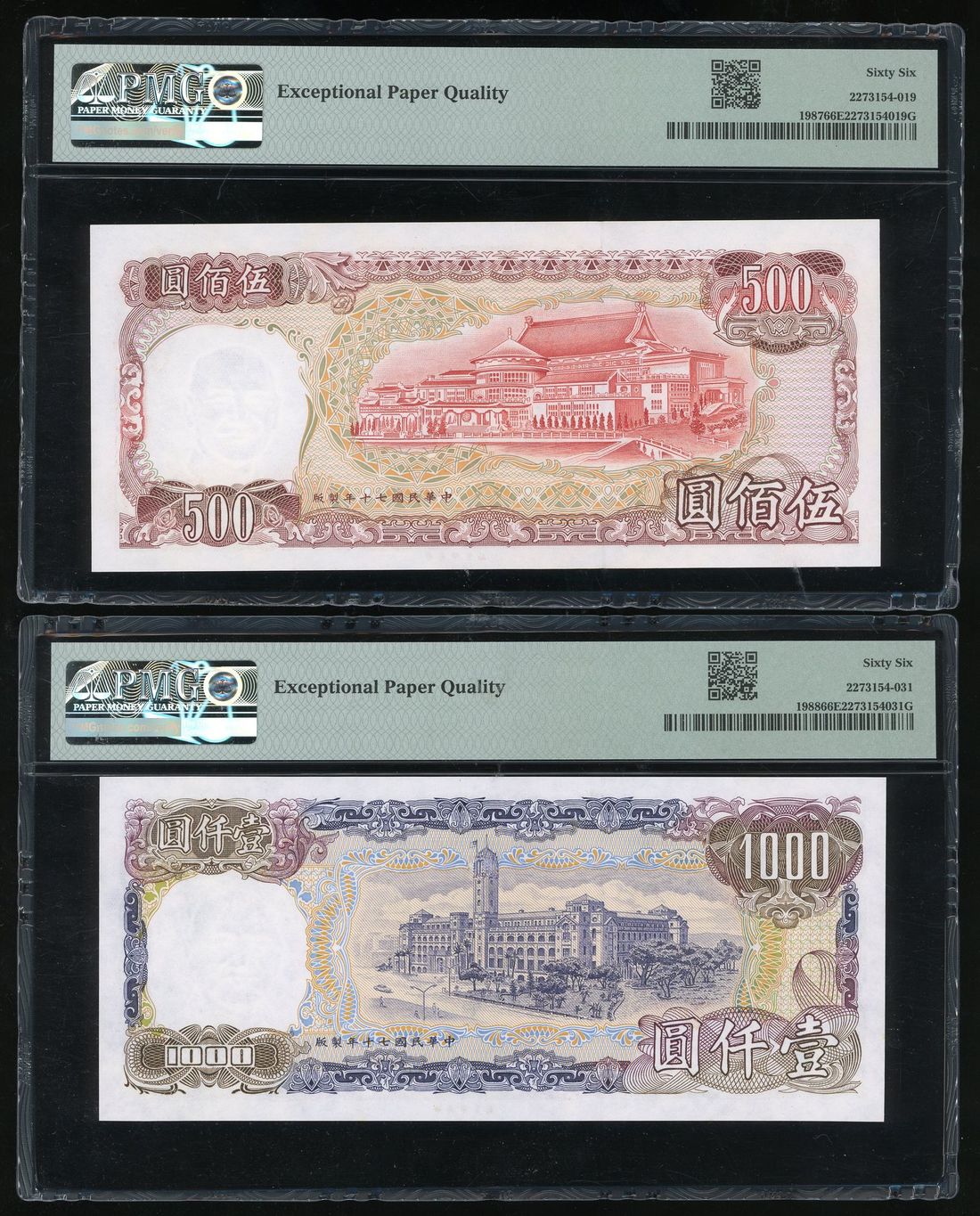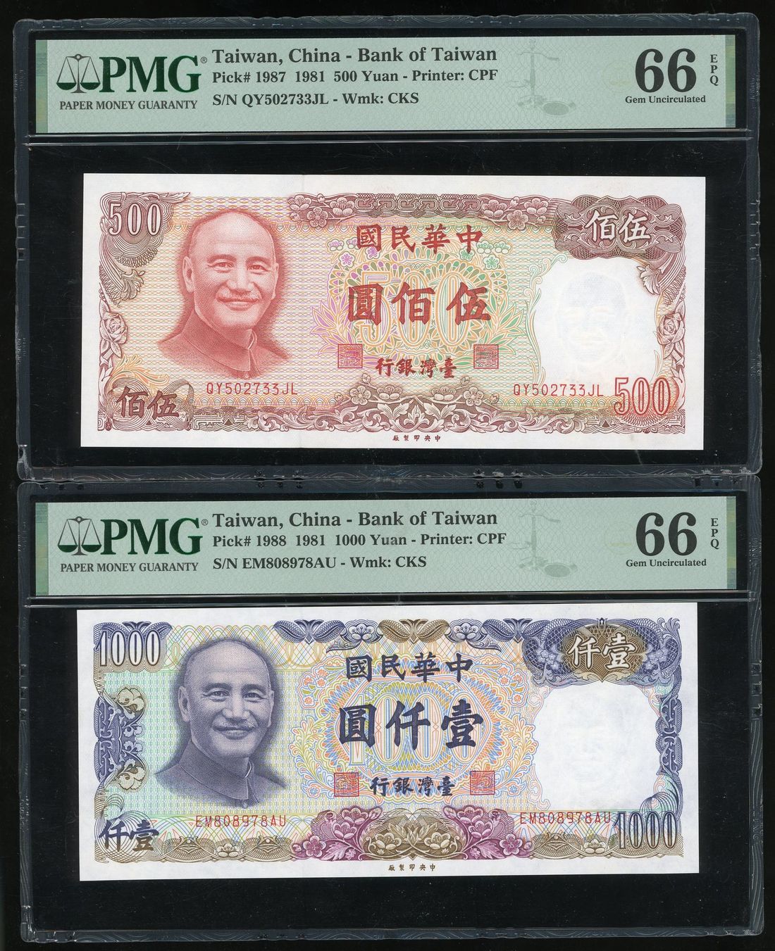 Bank of Taiwan, a pair, Year 70 (1981), including 500 and 1000 yuan, (Pick 1987, 1988), both PMG 66EPQ (2)