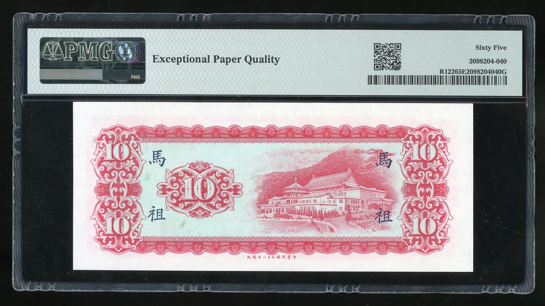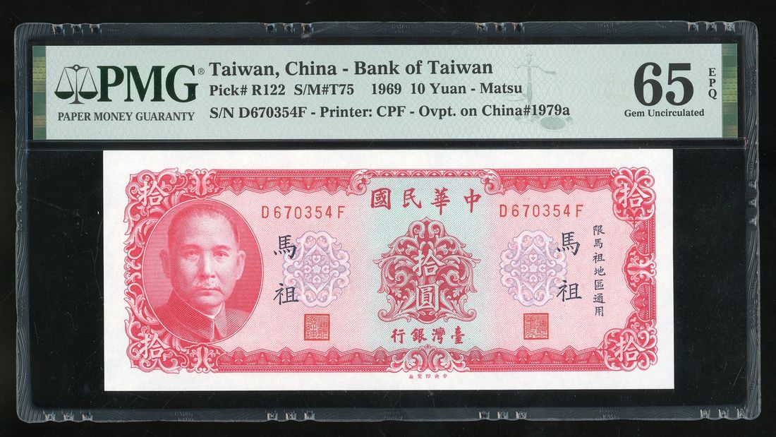 Bank of Taiwan, Matsu Issue, 10 yuan, Year 58 (1969), serial number D670354F, (Pick R122), PMG 65EPQ