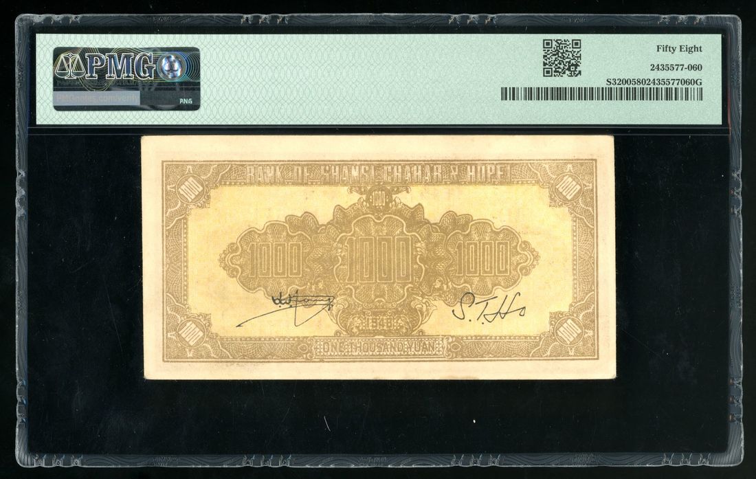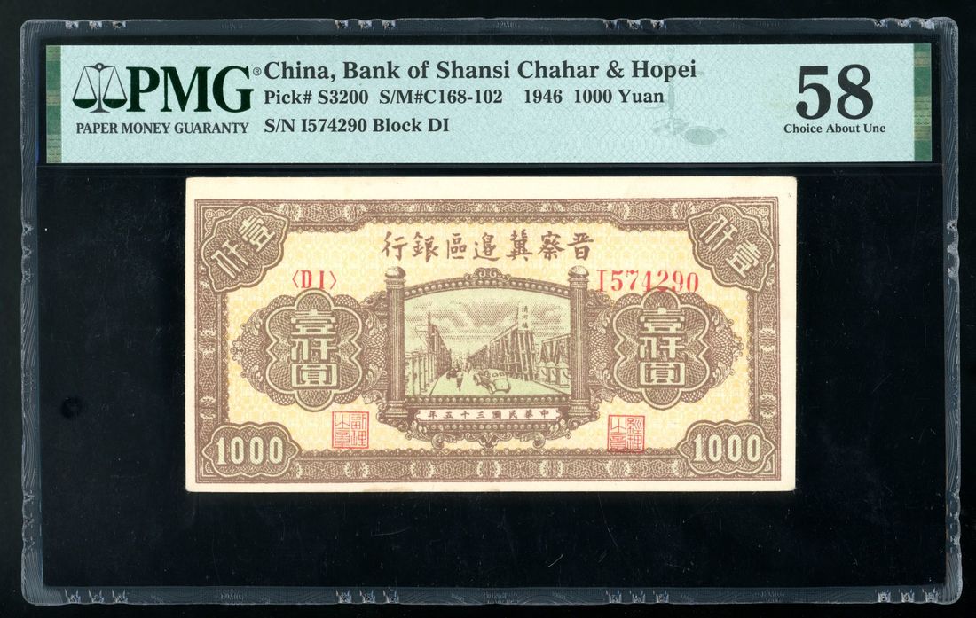 Bank of Shansi Chahar & Hopei, China, 1000 yuan, Year 35 (1946), serial number DI I574290, (Pick S3200), PMG 58
