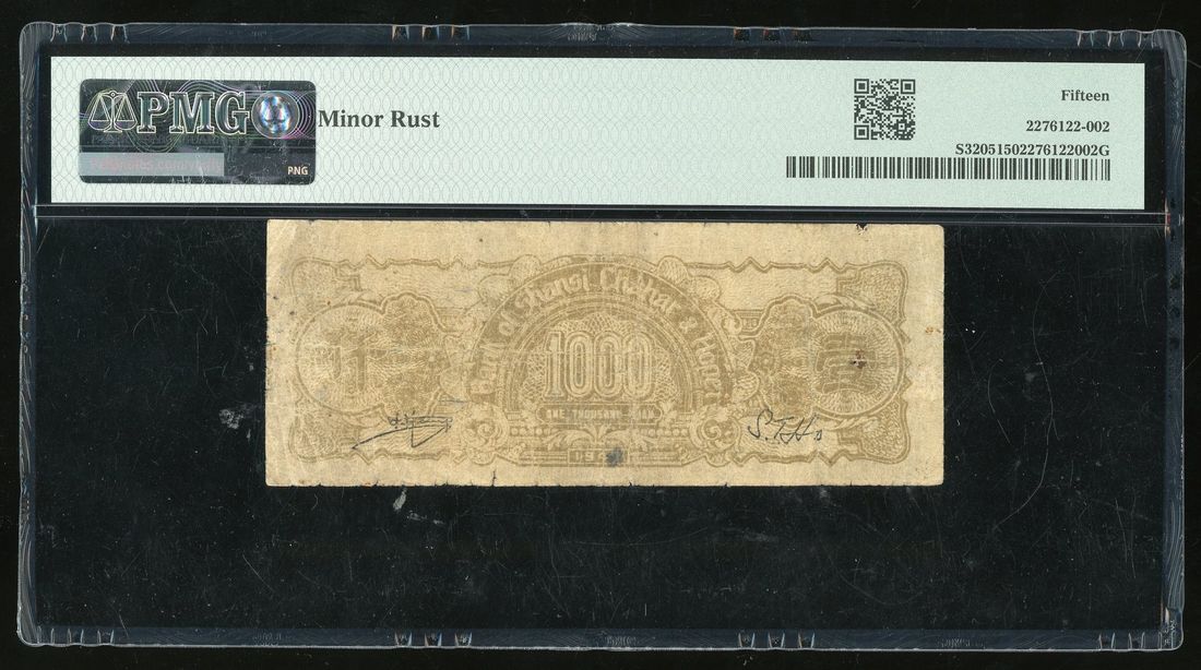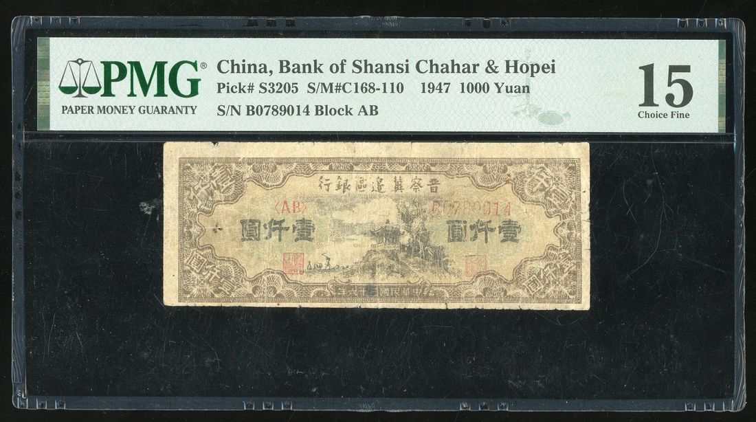 Bank of Shansi Chahar & Hopei, China, 1000 yuan, Year 36 (1937), serial number B0789014, (Pick S3205), PMG 15, minor rust.
