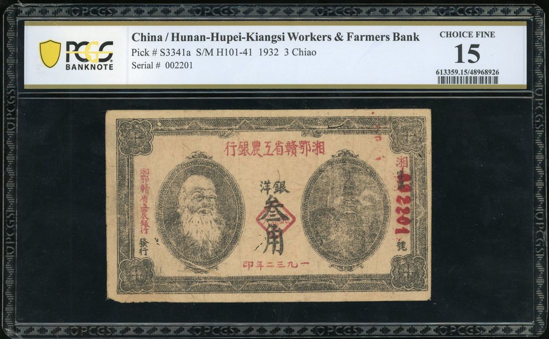 Hunan Hupei Kiangsi Workers & Farmers Bank, China, 3 chiao, 1932, serial number 002201, (Pick S3341a), PCGS 15 choice fine.