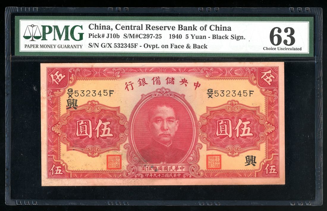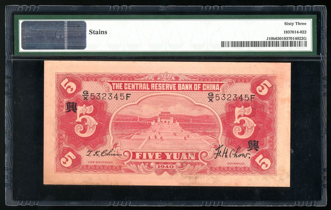 Central Reserve Bank of China, 5 yuan, Year 29 (1940), serial number G/X 532345F, (Pick J10b), PMG 63, stains. The earlier issue and quite scarce with stamp overprints