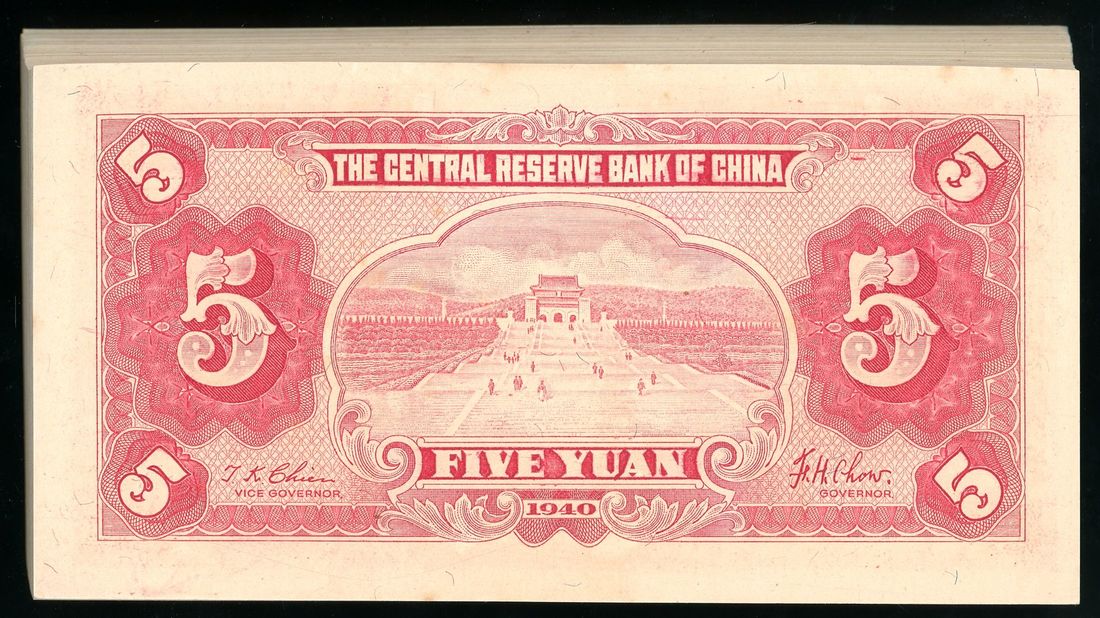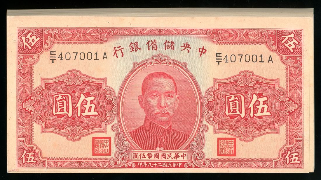 Central Reserve Bank of China, consecutive bundle of 5 yuan (100), Year 29 (1940), serial numbers E/T 407001-100A, (Pick J10), some handling, balance uncirculated (100)