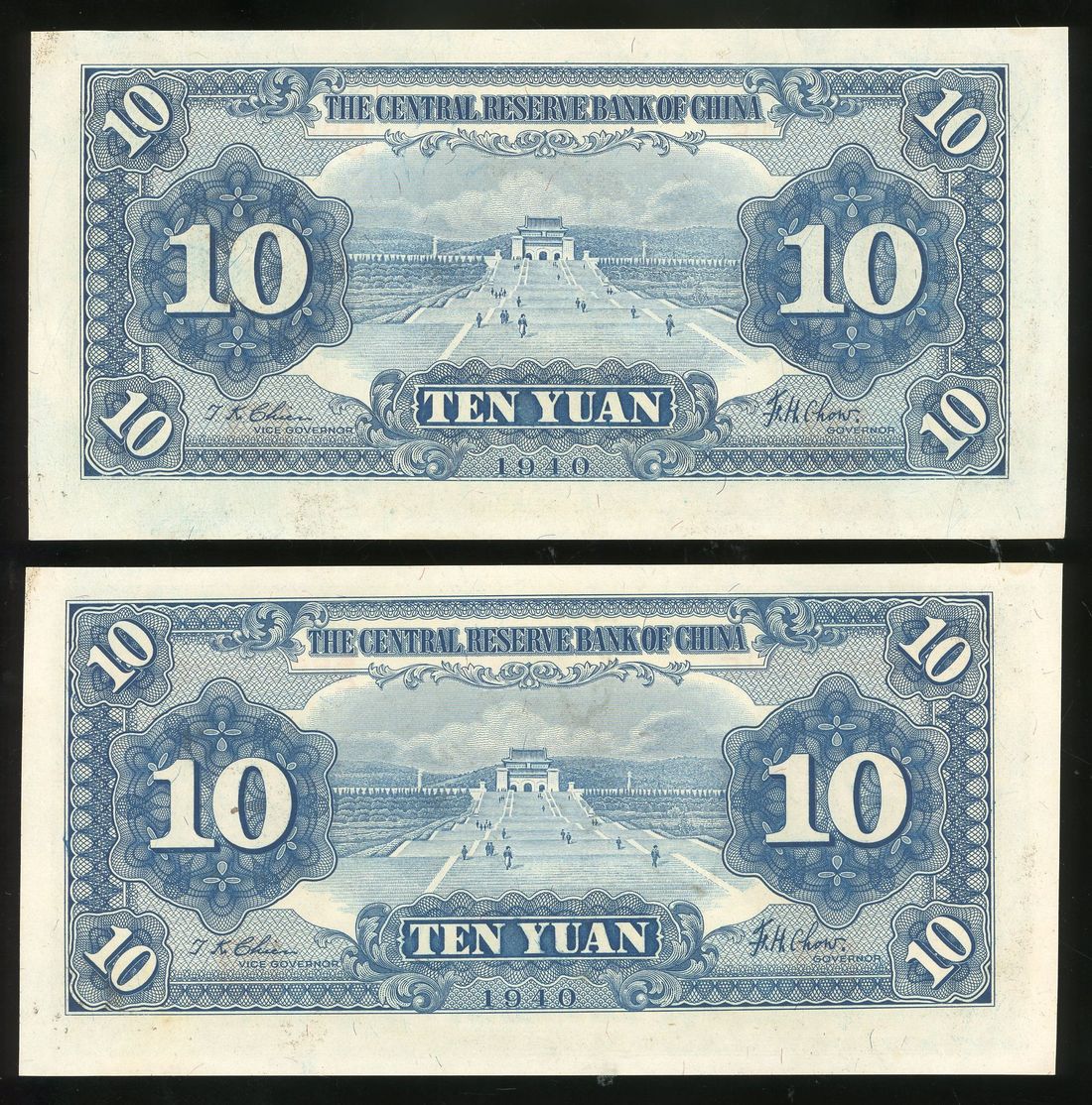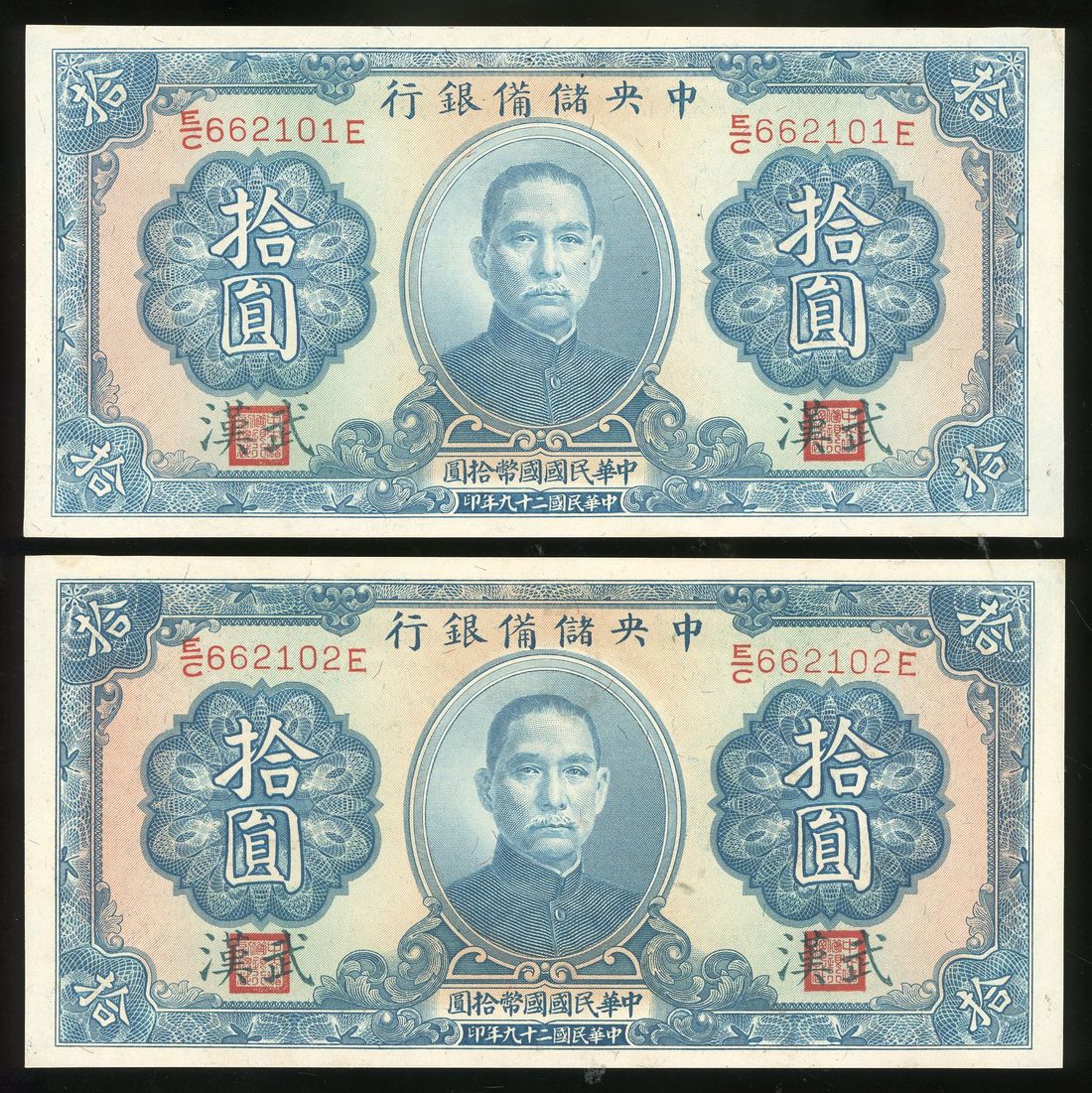 Central Reserve Bank of China, consecutive pair 10 yuan, Year 29 (1940), serial numbers E/C 662101/2 E, Wuhan overprint, (Pick J12i), uncirculated (2)