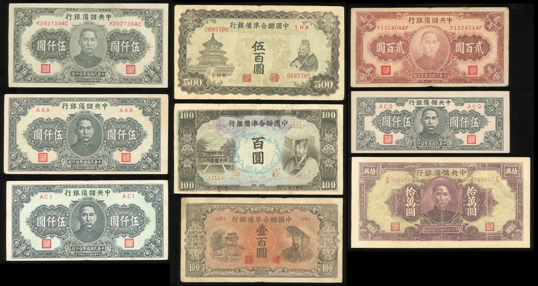 Japanese Occupation, China, a group of 9x, including, -Federal Reserve Bank of China, 100 yuan (2) ND (1945) and 500 yuan ND (1944),