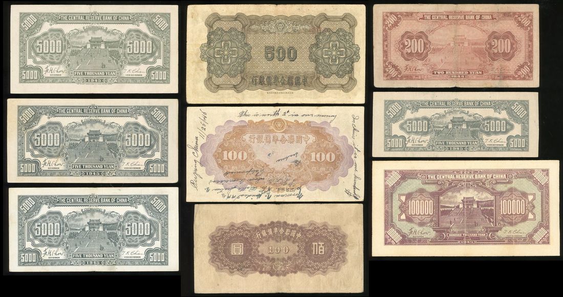 -Central Reserve Bank of China, 200 yuan Year 33, 5000 yuan (4), Year 34, 100,000 yuan Year 34,