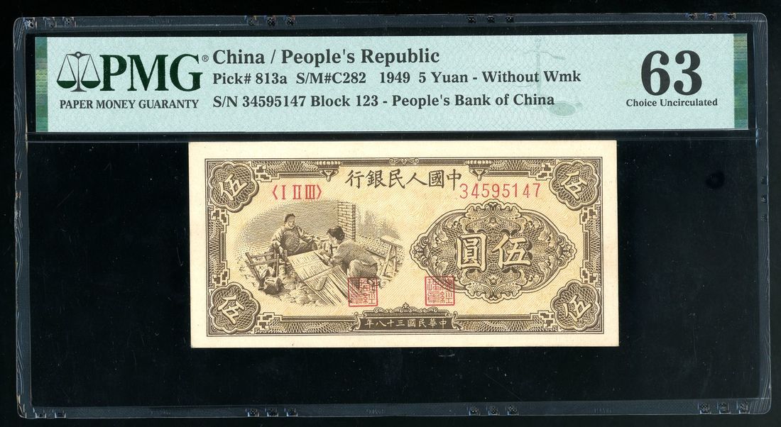 People's Bank of China, 1st Series Renminbi, 1949, 5 yuan, serial number I II III 343595147, "weaving",