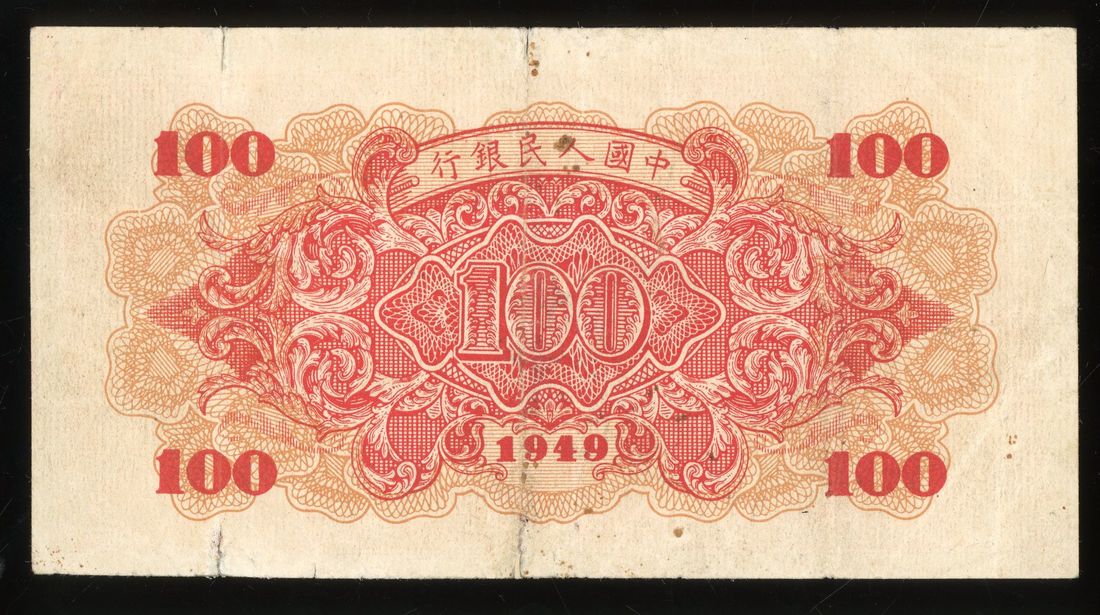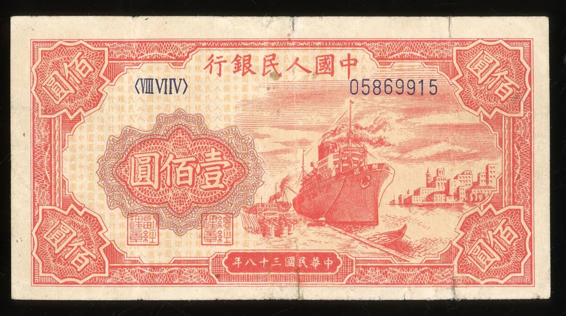 People's Bank of China, 1st Series Renminbi, 1949, 100 yuan, serial number VIII VI IV 05869915, "Red Ship",