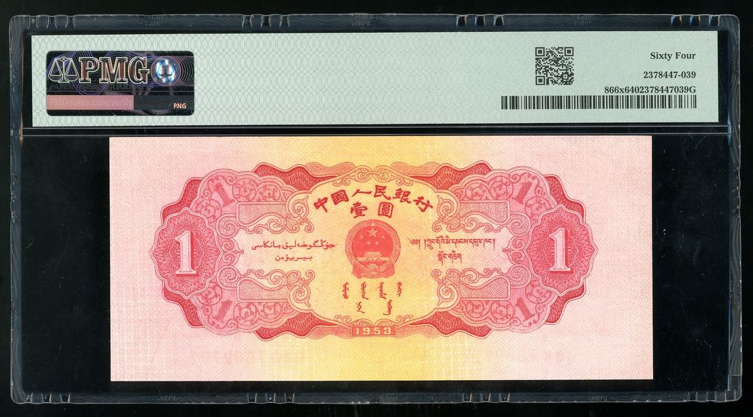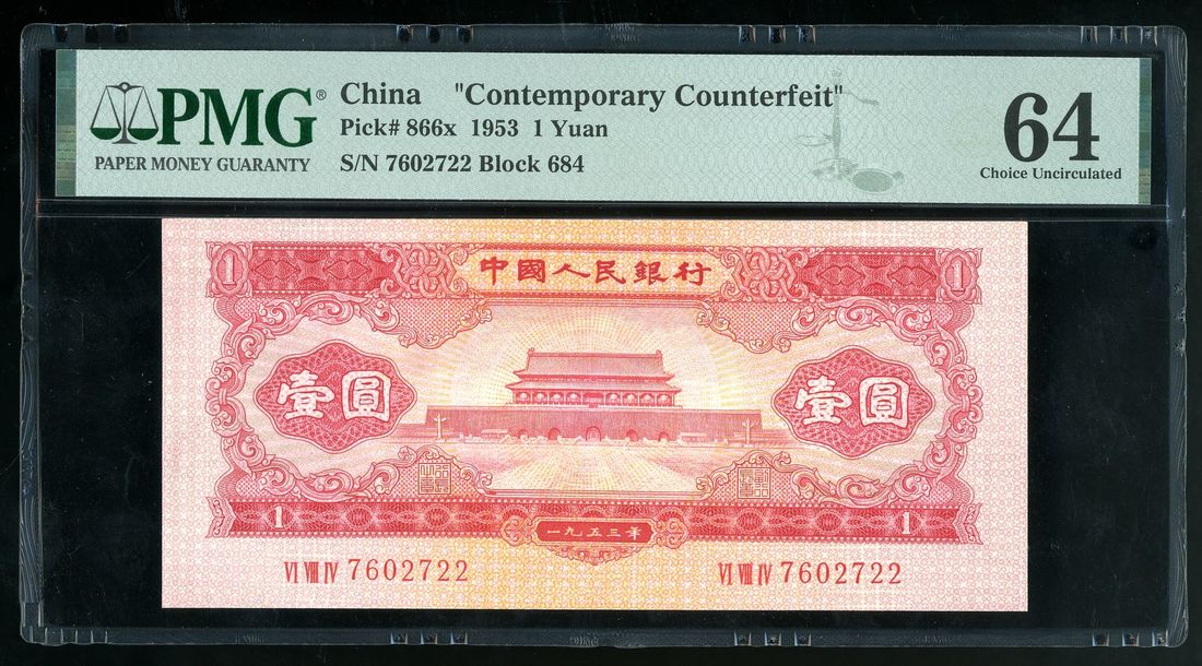 People's Bank of China, CONTEMPORARY COUNTERFEIT, 1953, 1 yuan, serial number VI VIII IV 7602722, (Pick 866x), PMG 64EPQ