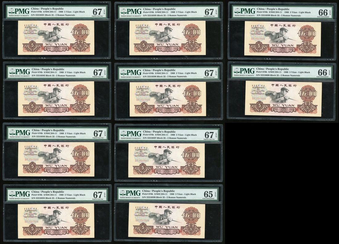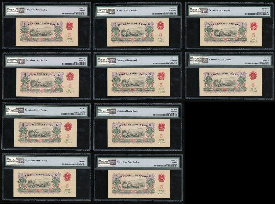 People's Bank of China, 3rd Series Renminbi, 1960, consecutive 5 yuan, 1960, serial numbers II V 22310591-600 (Pick 876b), 7x PMG 67EPQ, 2x PMG 66EPQ and 1x PMG 65EPQ (10)