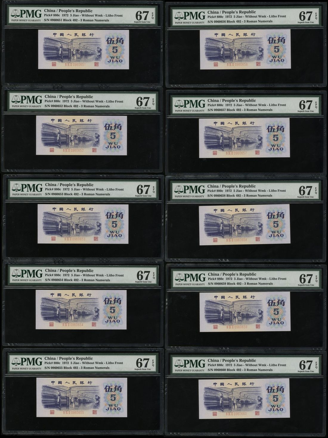 People's Bank of China, 3rd Series Renminbi, 1972, consecutive 5 jiao (10), serial numbers IV IX II 0960651-60, no watermark, lithograph printing,