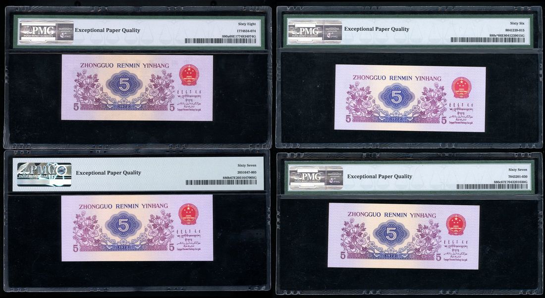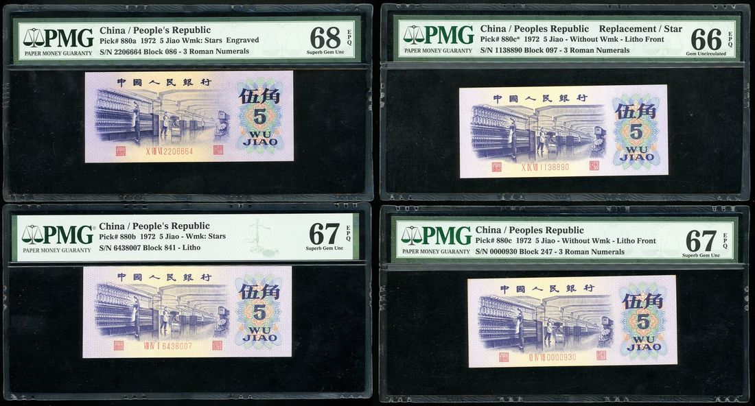 People's Republic, China, 3rd Series Renminbi, 1972, 5 jiao (4), serial numbers X VIII VI 2206664, VIII IV I 6438007, II IV VII 0000930, X IX VII 1138890, (Pick 880a, 880b, 880c, 880c*), PMG 68EPQ, 67EPQ, 67EPQ, 66EPQ, respectively (4)