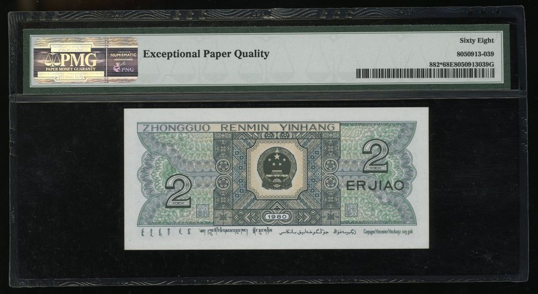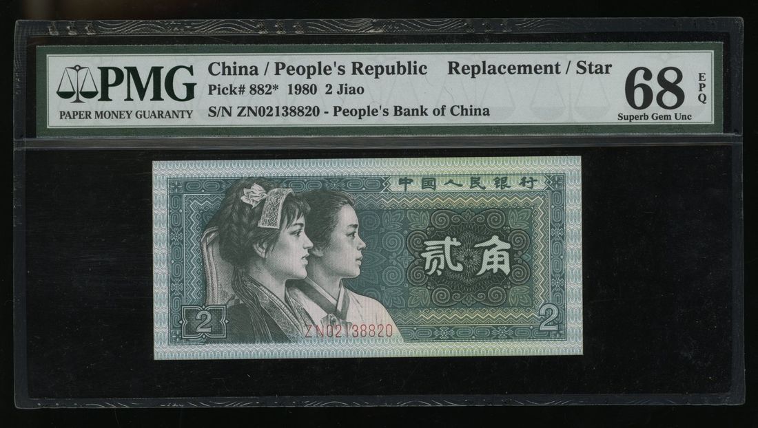 People's Bank of China, 4th Series Renminbi, replacement 2 jiao, 1980, serial number ZN02138820, (Pick 882*), PMG 68EPQ.
