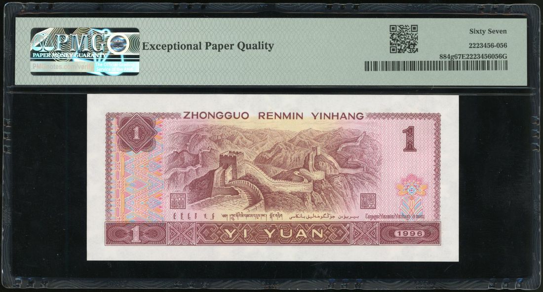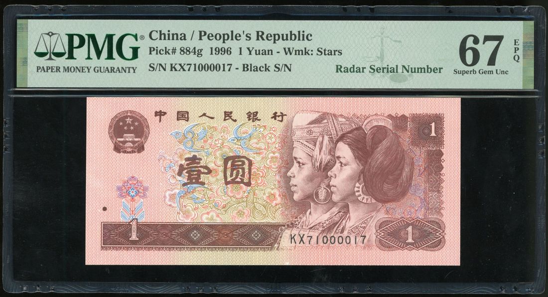 People’s Bank of China, 4th Series Renminbi, 1996, 1 yuan, radar serial number KX71000017, (Pick 884g), PMG 67EPQ Superb Gem Uncirculated.