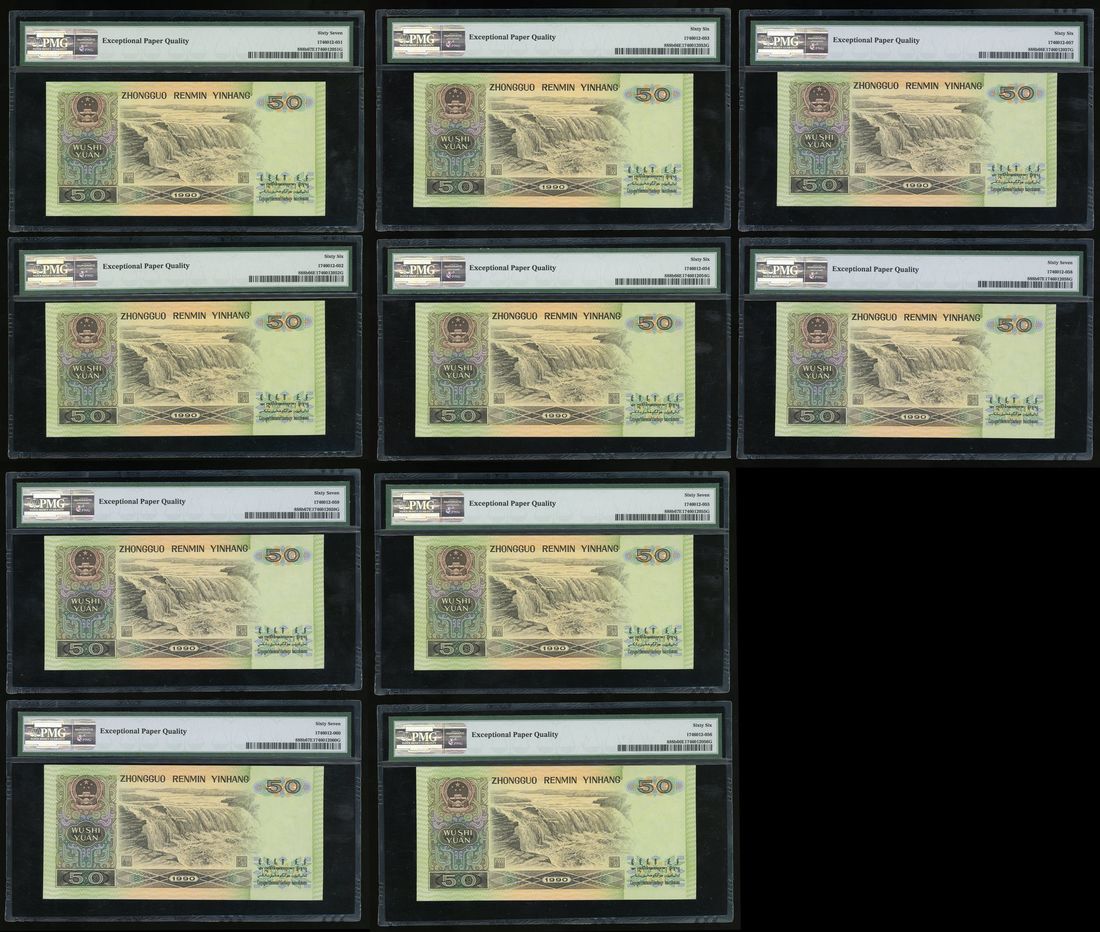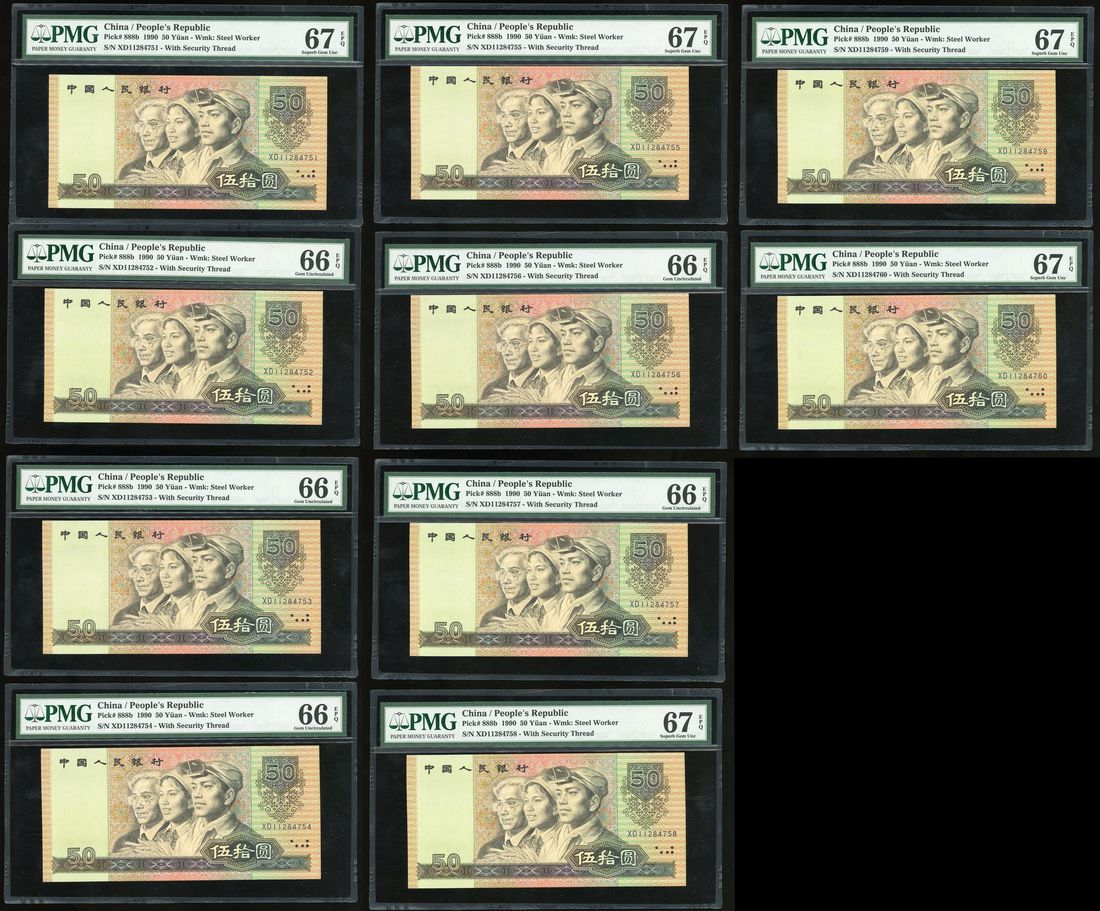 People's Bank of China, 4th series Renminbi, 1990, consecutive 50 yuan (10), serial numbers XD11284751-60, (Pick 888b), 5x PMG 66EPQ, 5x PMG 67EPQ (10)
