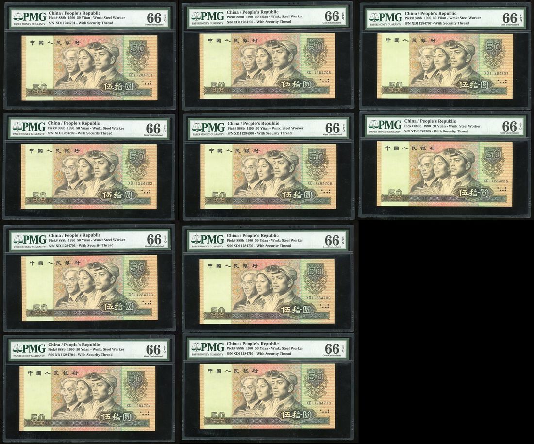 People's Bank of China, 4th Series Renminbi, 1990, consecutive 50 yuan (10), serial number XD11284701-10, (Pick 888b), PMG 66EPQ (10)