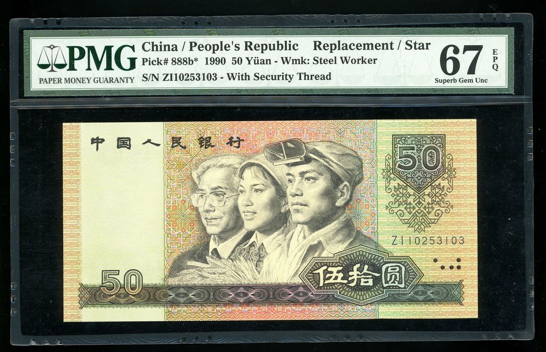 People's Bank of China, 50 yuan, 1990, replacement, serial number ZI 10253103, (Pick 888b*), PMG 67EPQ