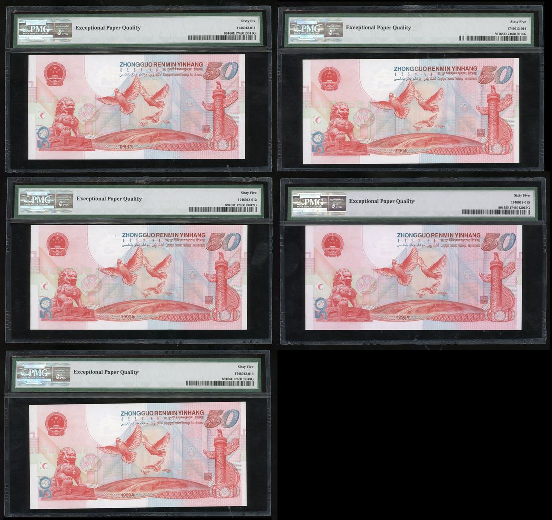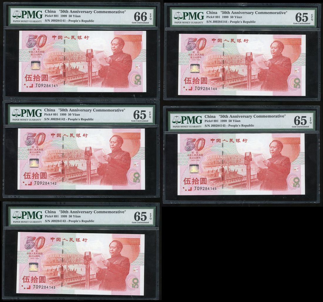 People's Bank of China, consecutive 50 yuan (5), 1999, serial number J09284141/2/3/4/5, (Pick 891), 1st note PMG 66EPQ, others PMG 65EPQ (5)