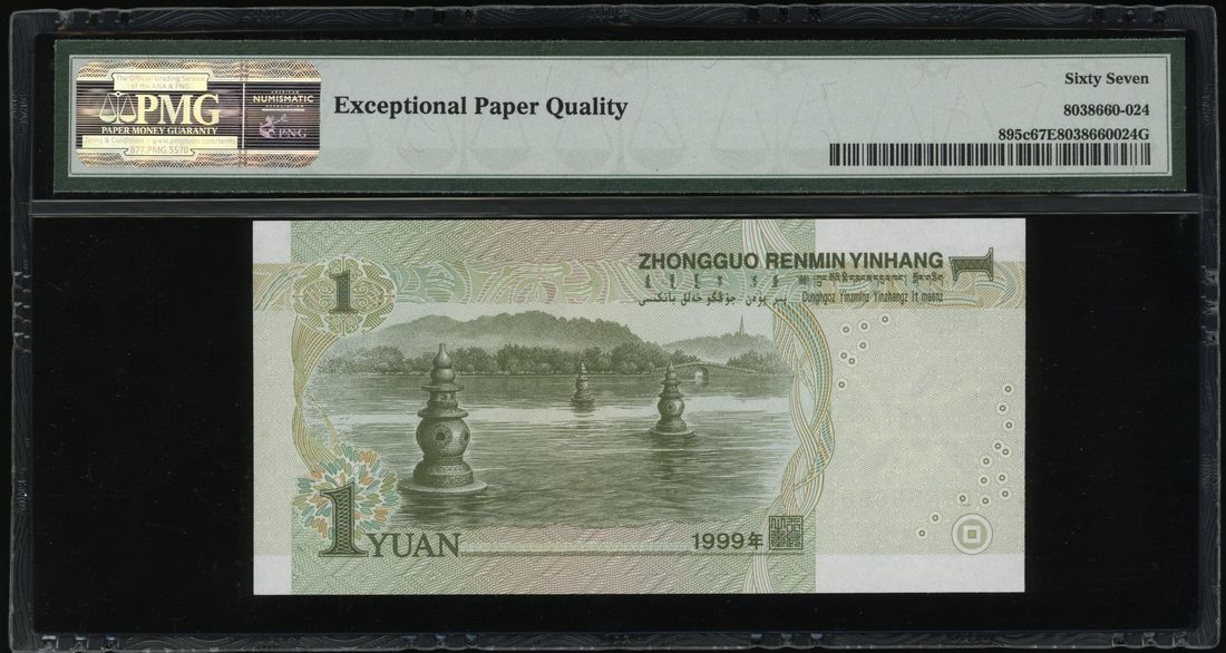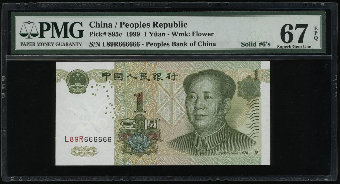 People's Bank of China, 5th Series Renminbi, 1999, 1 yuan, solid serial number L89R666666, (Pick 895c), PMG 67EPQ