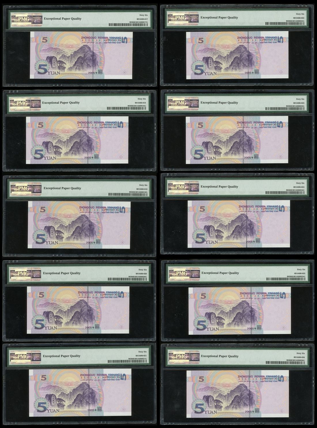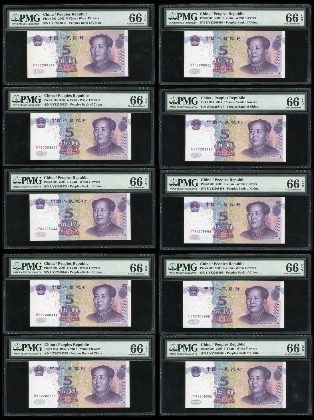 People’s Bank of China, 5th Series Renminbi, 2005, a group of 10x 5 yuan, fancy serial numbers UY82208111/222/333/444/555/666/777/888/999/9000, (Pick 903), all graded PMG 66EPQ Gem Uncirculated (10).