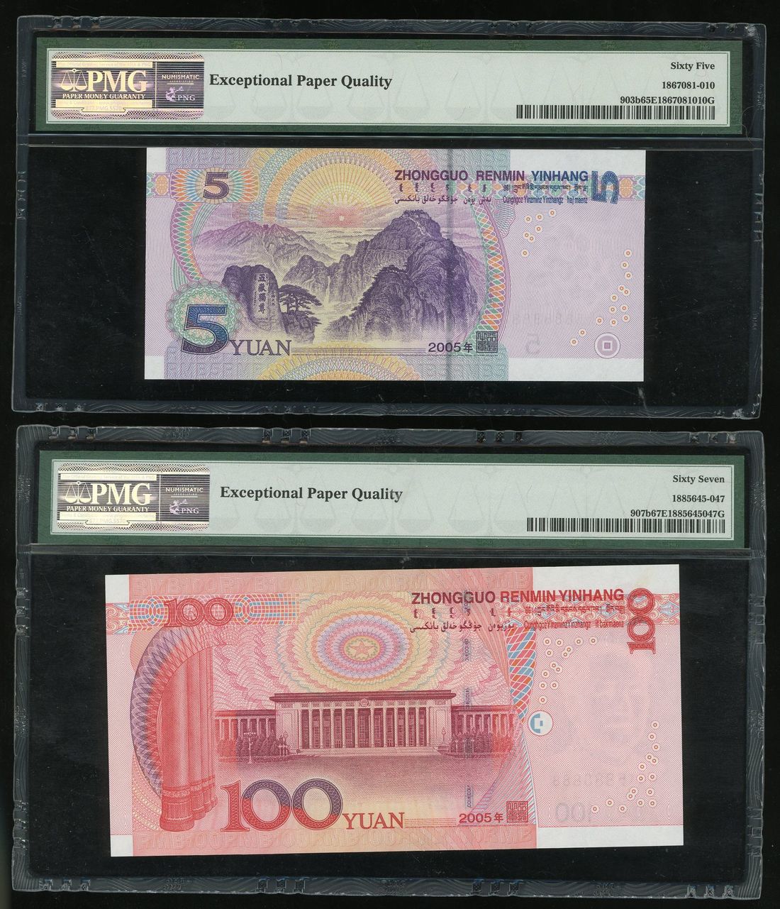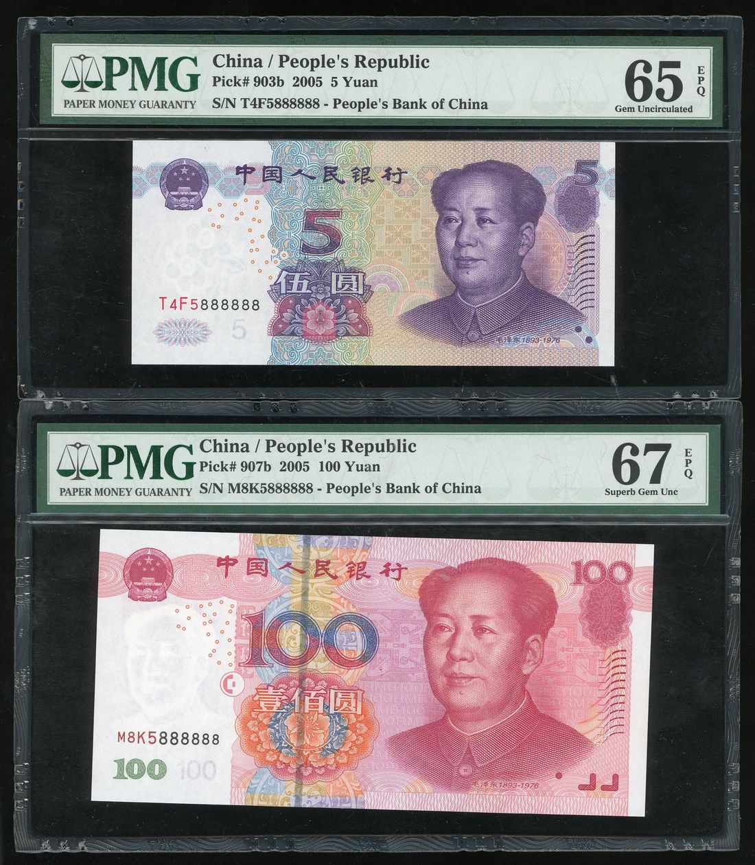 People's Bank of China, 5th Series Renminbi, 2005, including 5 and 100 yuan, matching serial number 888888, (Pick 903b), PMG 65EPQ and 67EPQ (2)