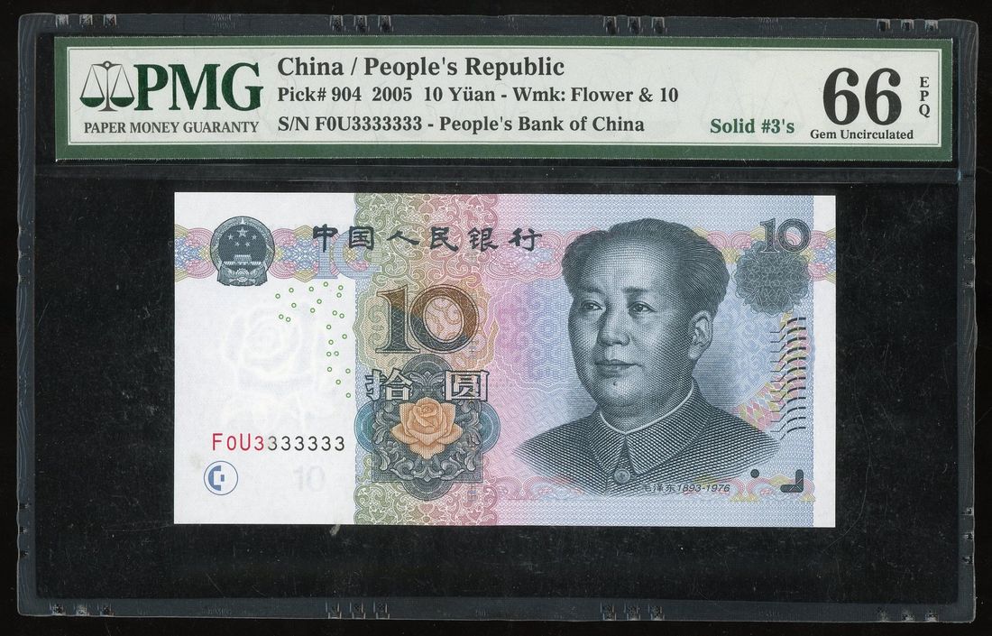 People's Bank of China, 5th Series Renminbi, 10 yuan, 1999, solid serial number F0U3 333333, (Pick 904), PMG 66EPQ