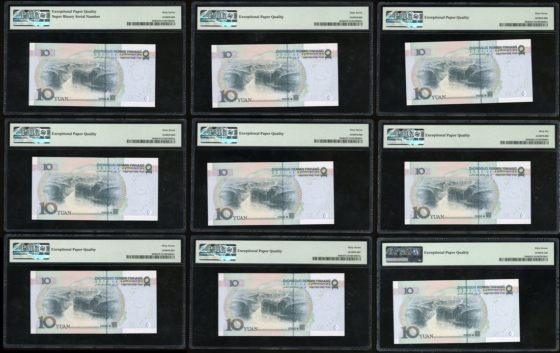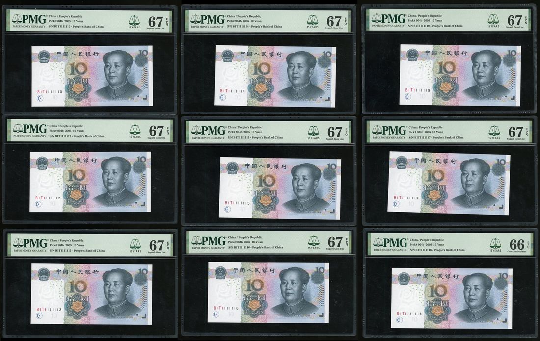 People's Bank of China, 5th Series Renminbi, 2005, 10 yuan (10), serial numbers B1T1111110/12-19, (Pick 904b), 9x PMG 67EPQ, 1x PMG 66EPQ (10)