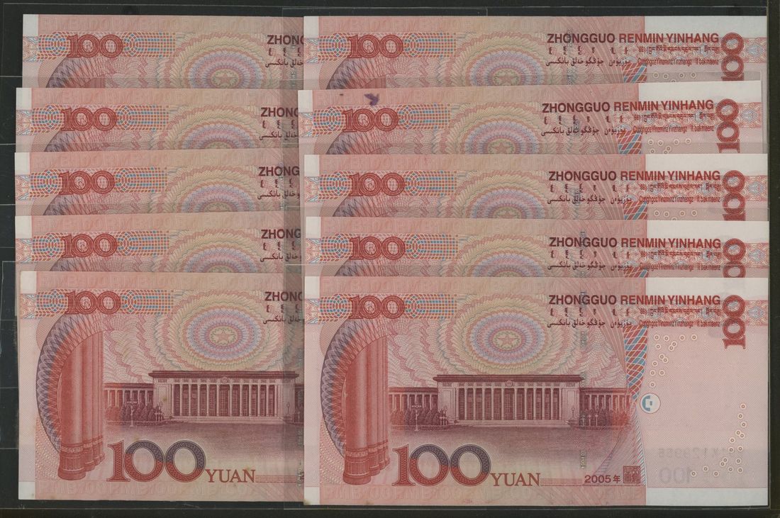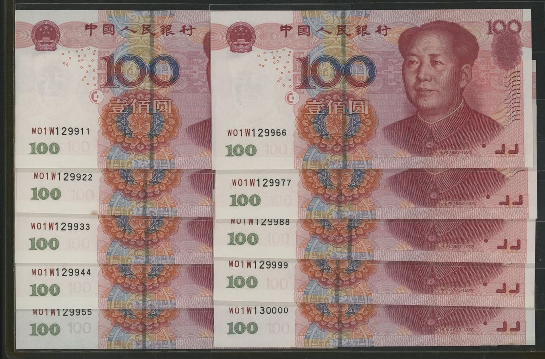 People's Bank of China, 5th Series Renminbi, 2005, 100 yuan (10), a group of fancy serial numbers, including: 129911, 129922, 129933, 129944, 129955, 129966, 129977, 129988, 129999 and 130000, all with the same prefix W01W,