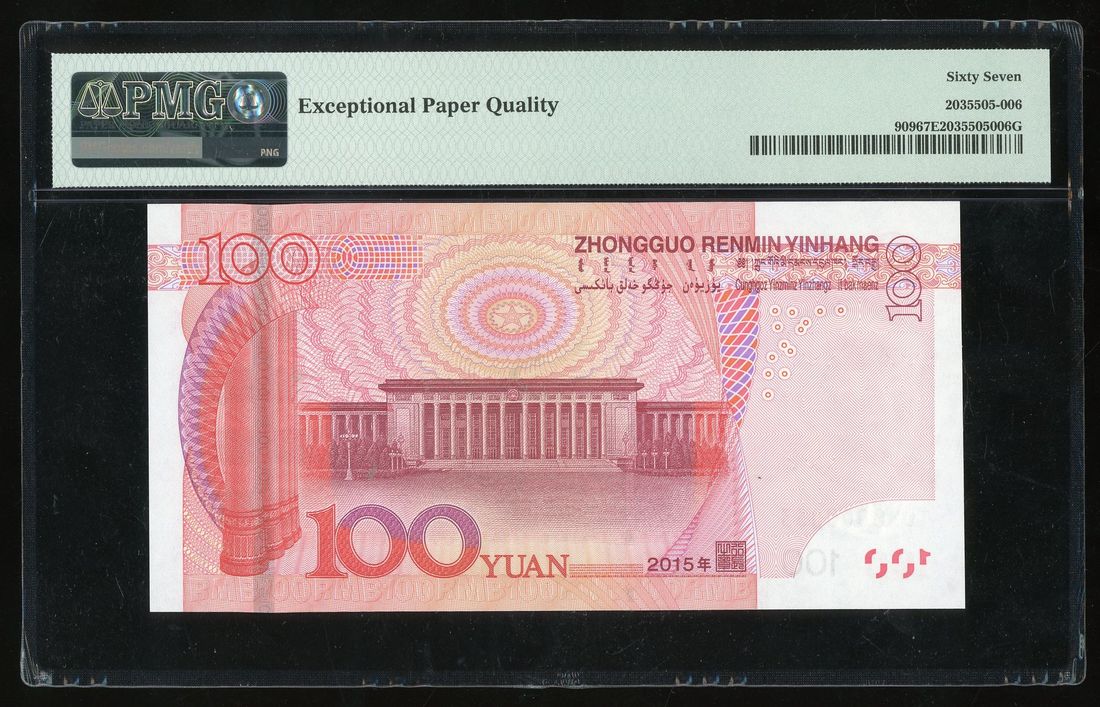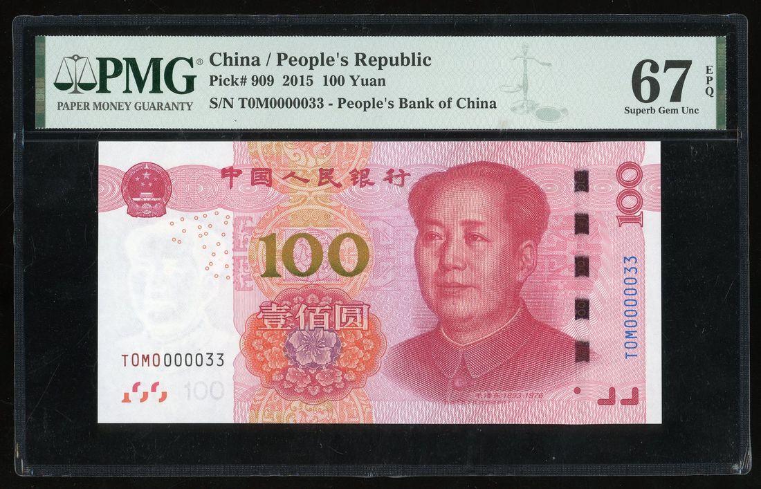 People's Bank of China, 5th Series Renminbi, 100 yuan, 2015, low serial numbers T0M0 000033, (Pick 909), PMG 67EPQ
