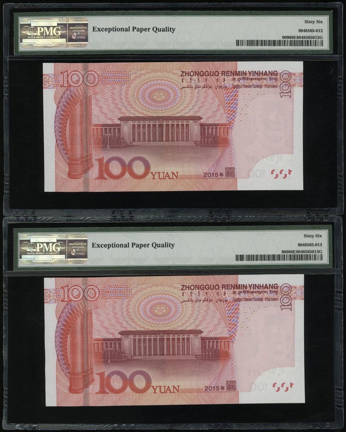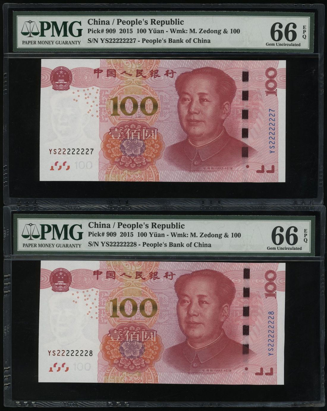 People's Bank of China, 5th Series Renminbi, 2015, consecutive 100 yuan pair, serial numbers YS22222227/8, (Pick 909), both PMG 66EPQ (2)